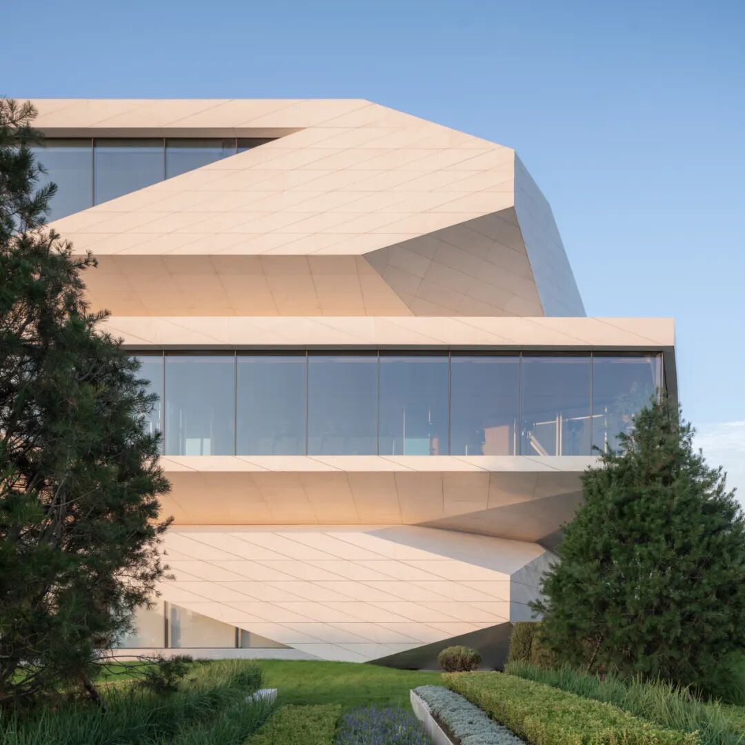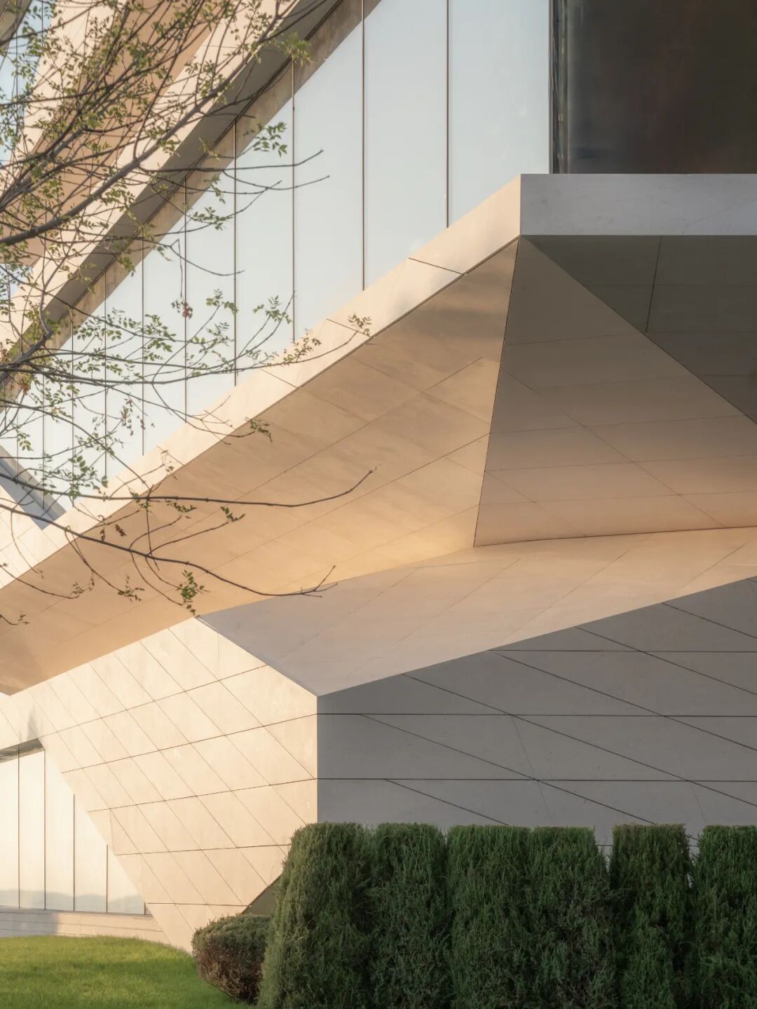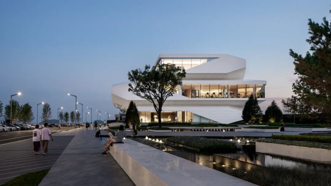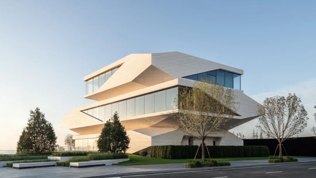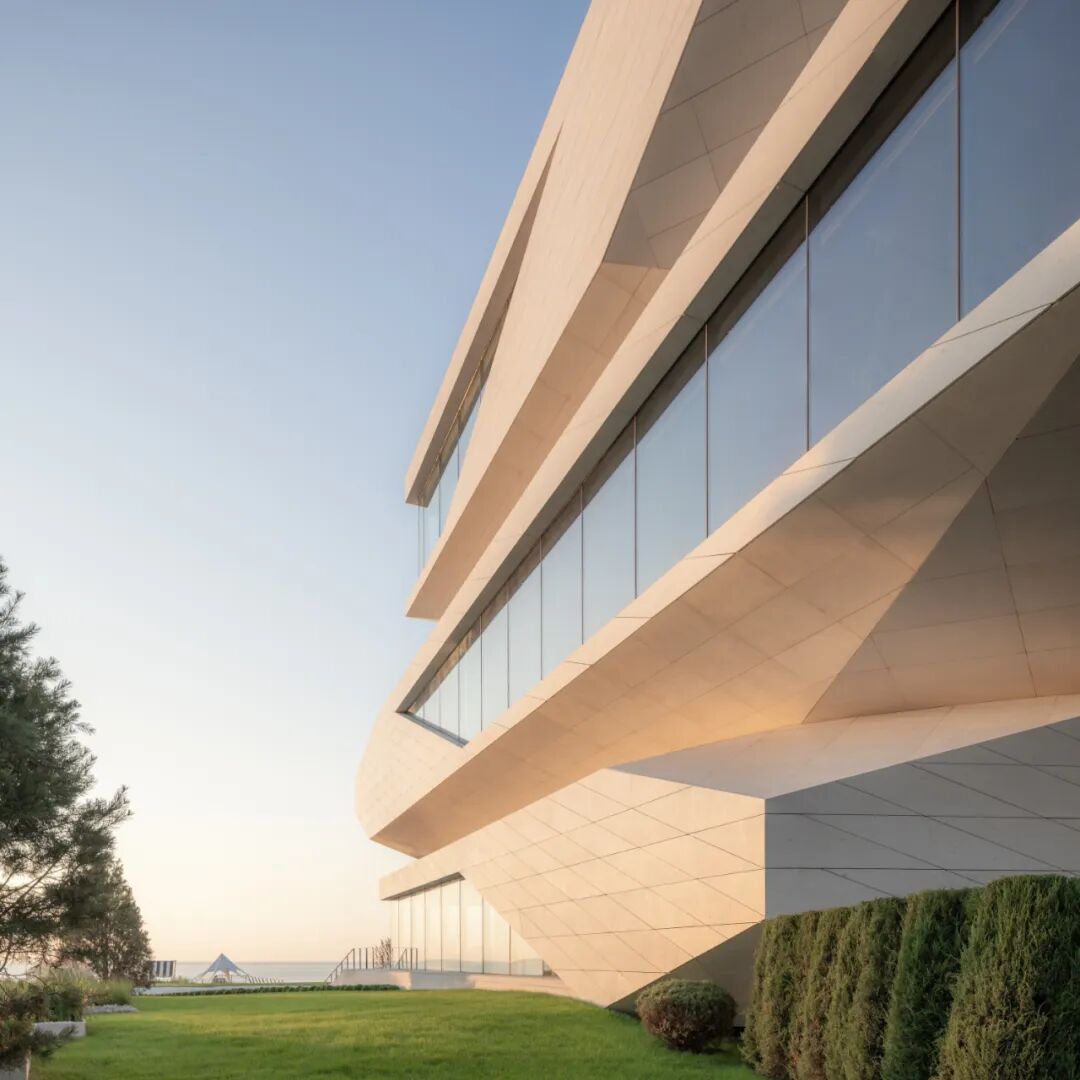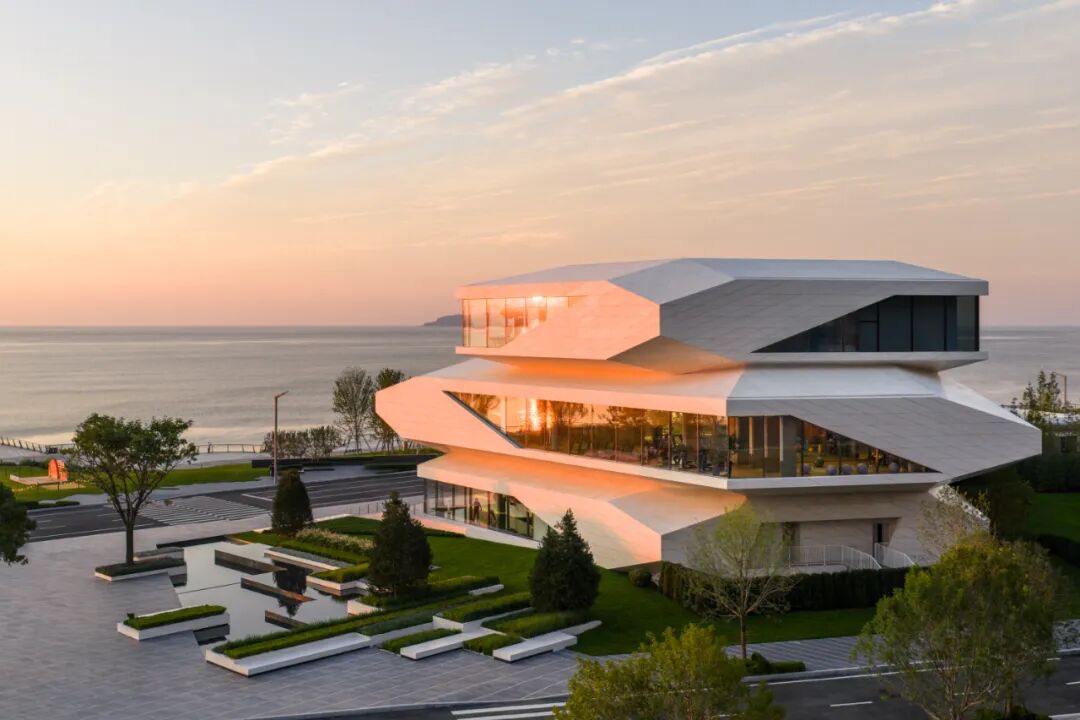 建筑立面采用蜂窝石材和超白玻璃,弱化体量的厚重感,强化形象张力与吸引力。米黄色石材依据结构模数划分,以菱形为单元进行参数化排布,模拟礁石风化后的裂隙肌理,在理性秩序中嵌入自然生成的偶然性。玻璃体块则如礁石孔洞,虚实之间,倒映出海天光色的变化。