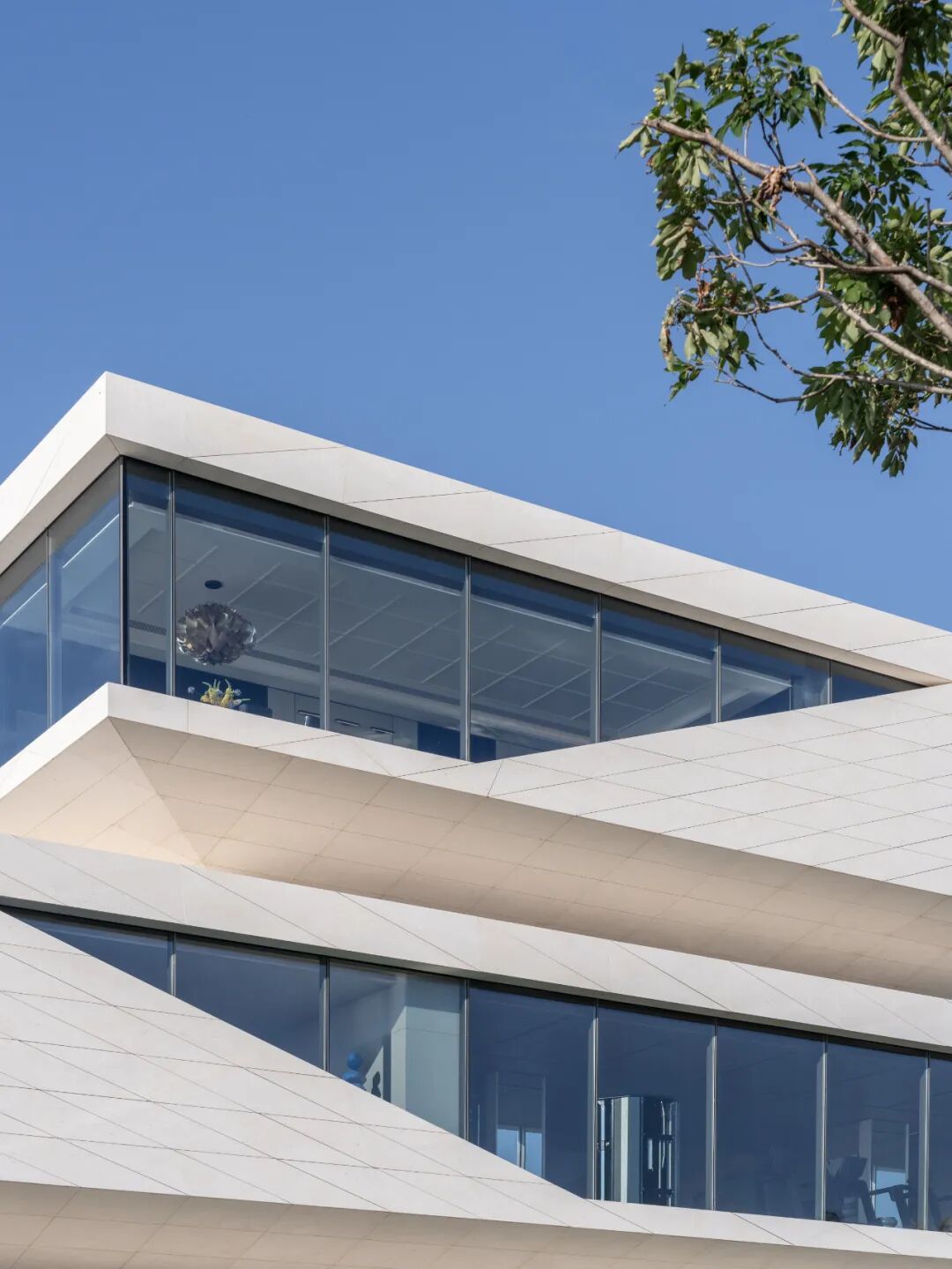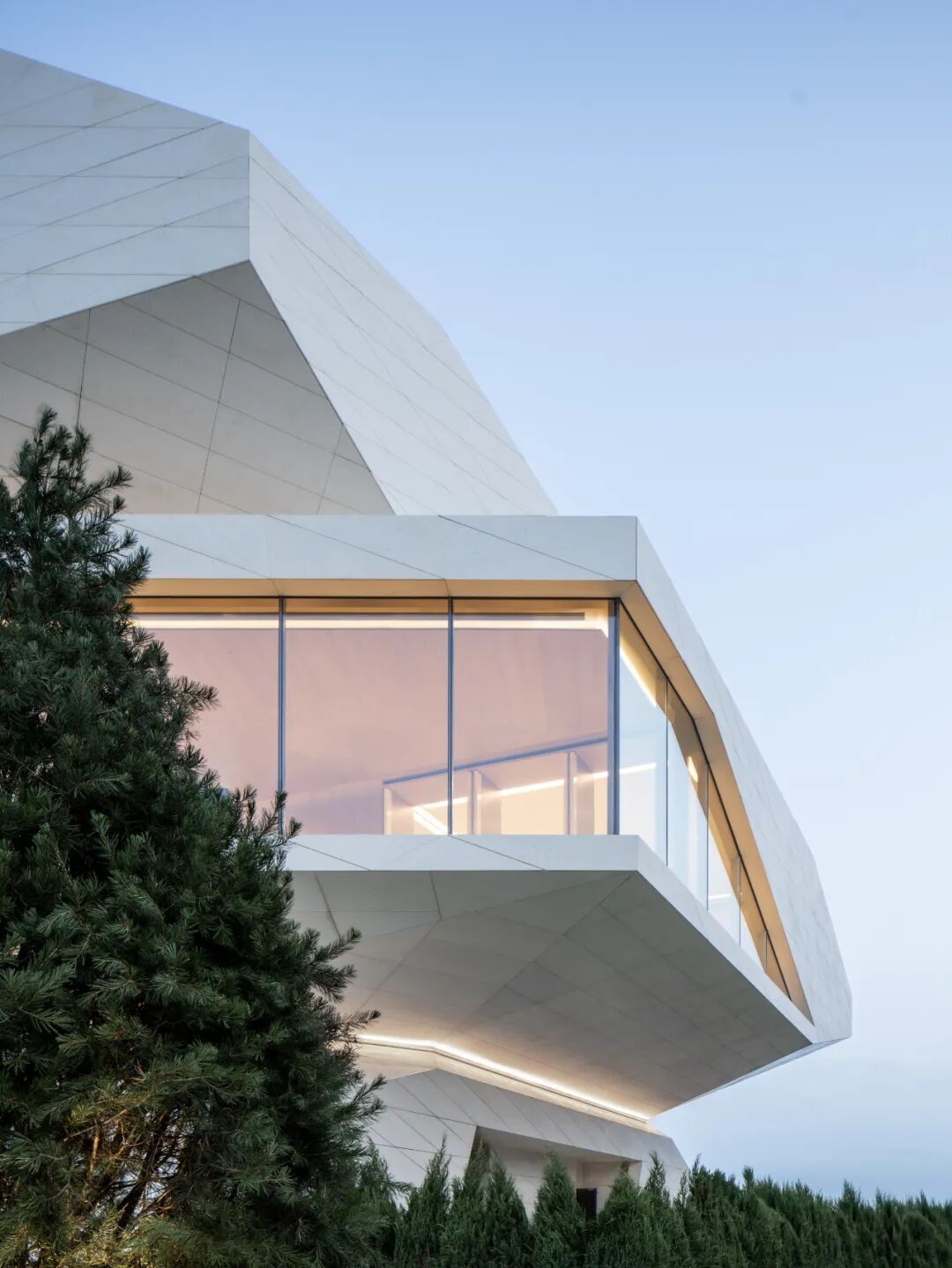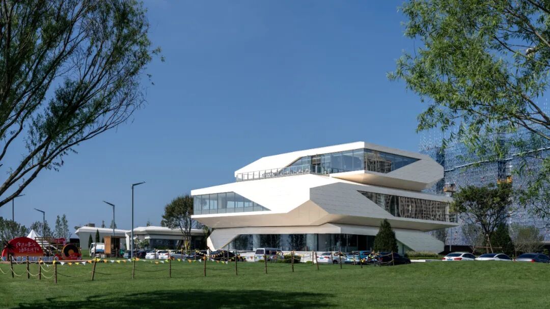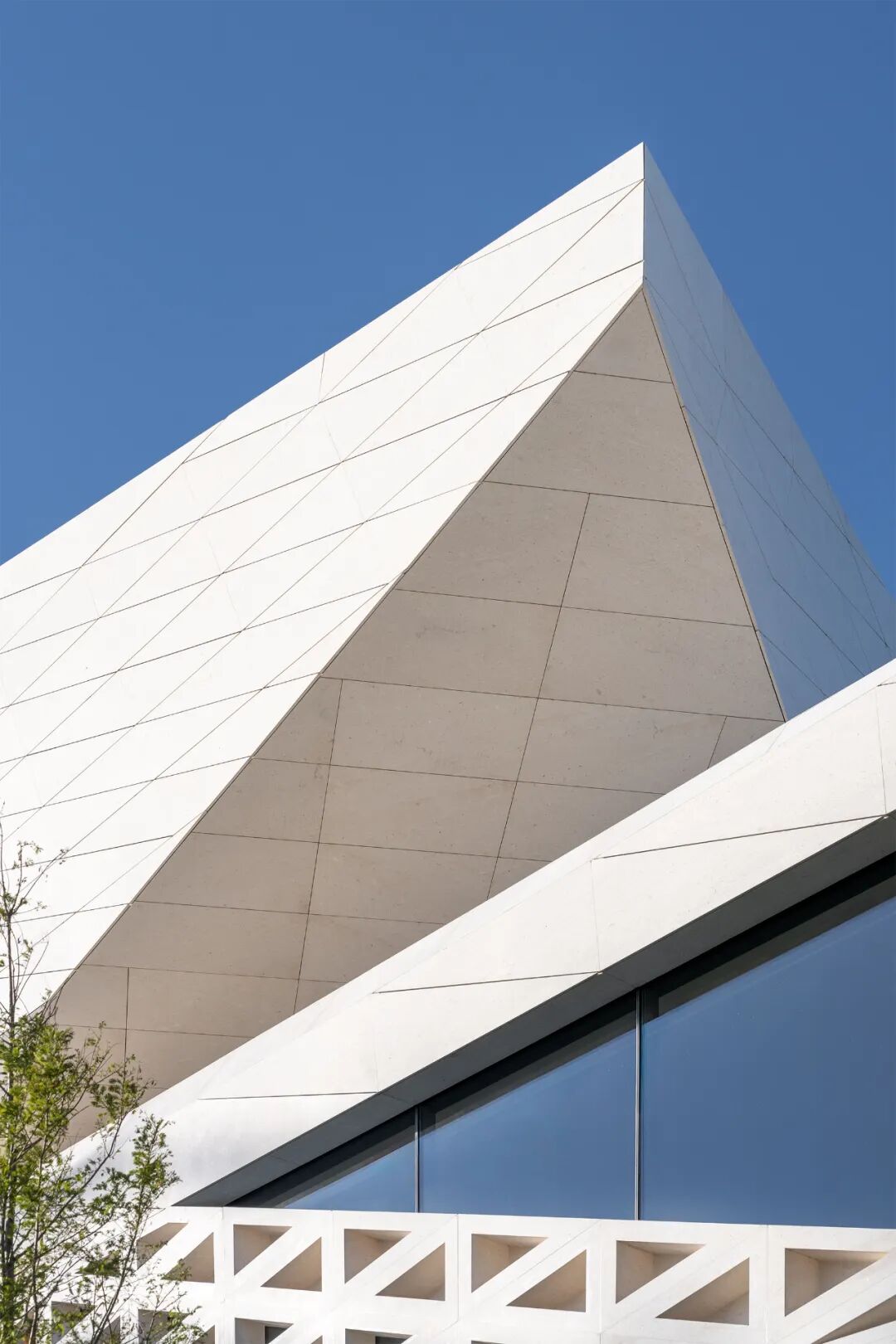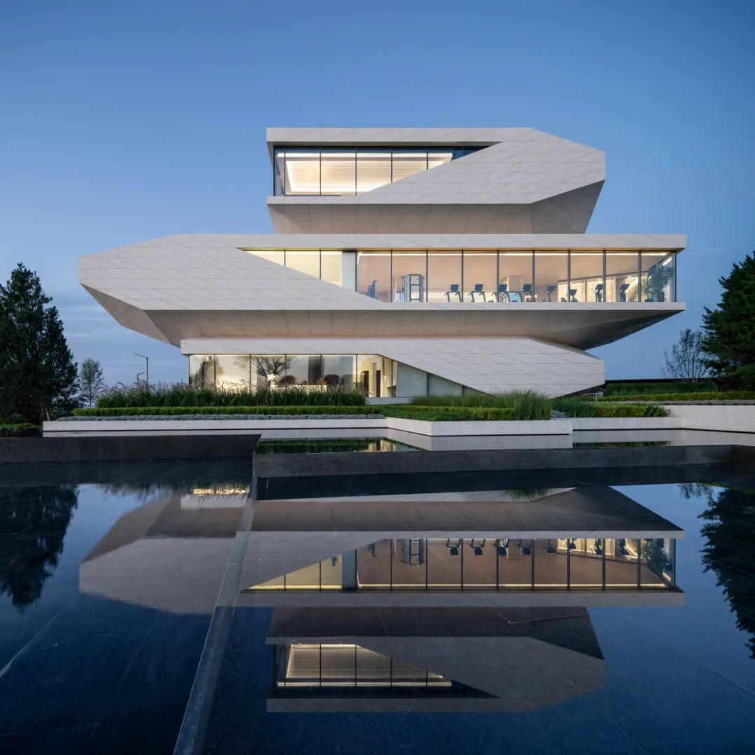 建筑立面采用蜂窝石材和超白玻璃,弱化体量的厚重感,强化形象张力与吸引力。米黄色石材依据结构模数划分,以菱形为单元进行参数化排布,模拟礁石风化后的裂隙肌理,在理性秩序中嵌入自然生成的偶然性。玻璃体块则如礁石孔洞,虚实之间,倒映出海天光色的变化。