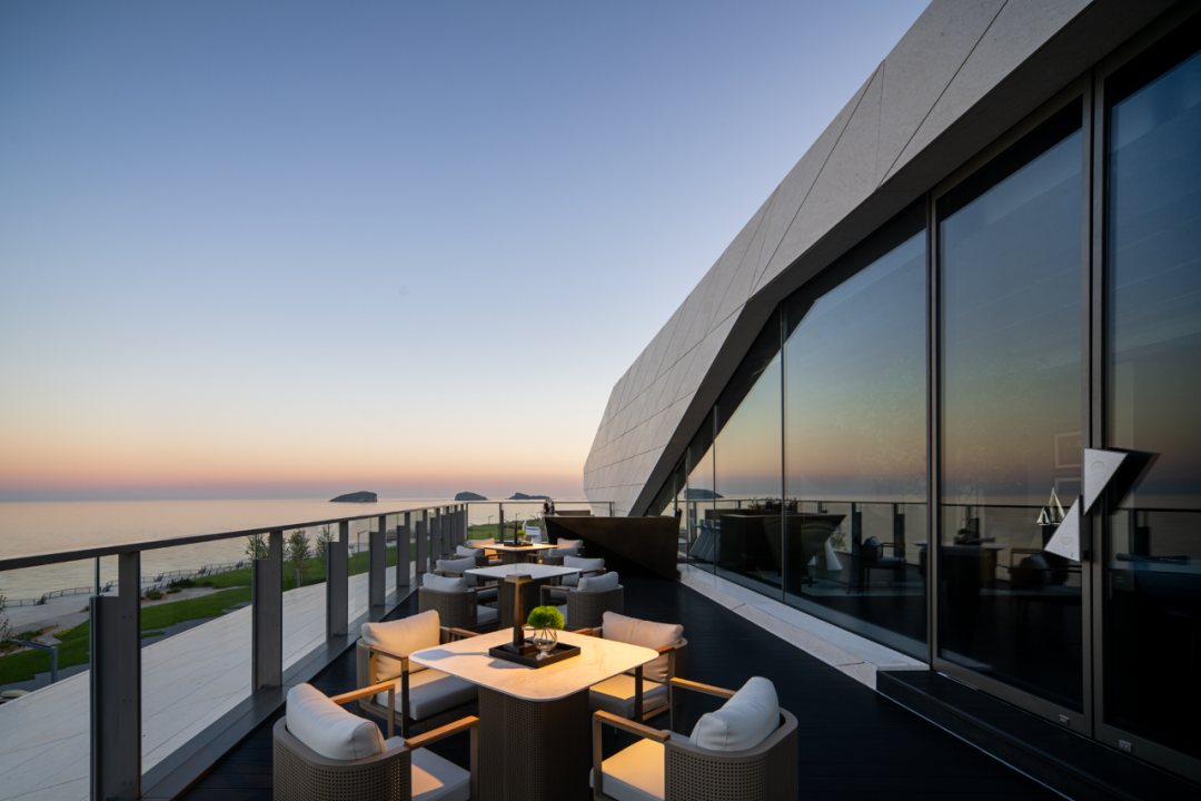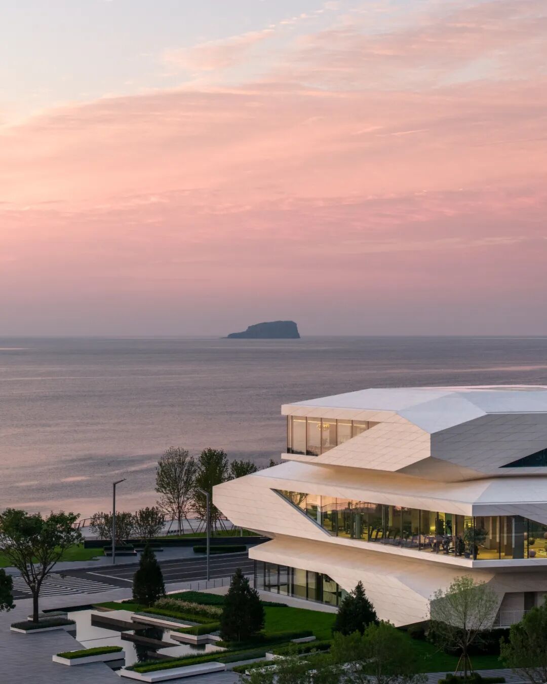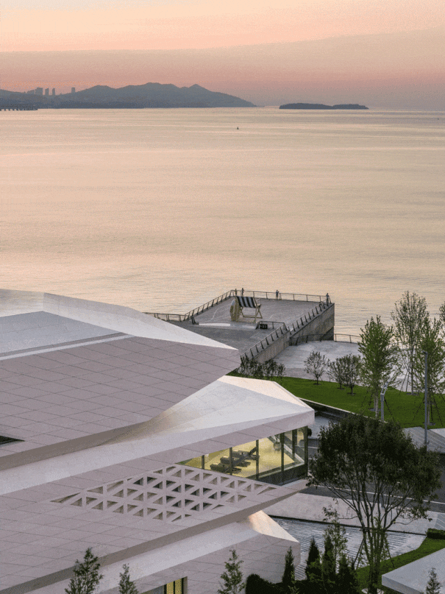 三块大小各异、形态独立的体量以堆叠方式构成整体,如同一块静置于海岸的巨型“礁石”,与远处海岛遥相对望。通过洗练的几何形体与切角、切削的处理,获得轻盈而明确的体量关系,在海岸线上形成清晰的识别性,成为南端海岸的新坐标。