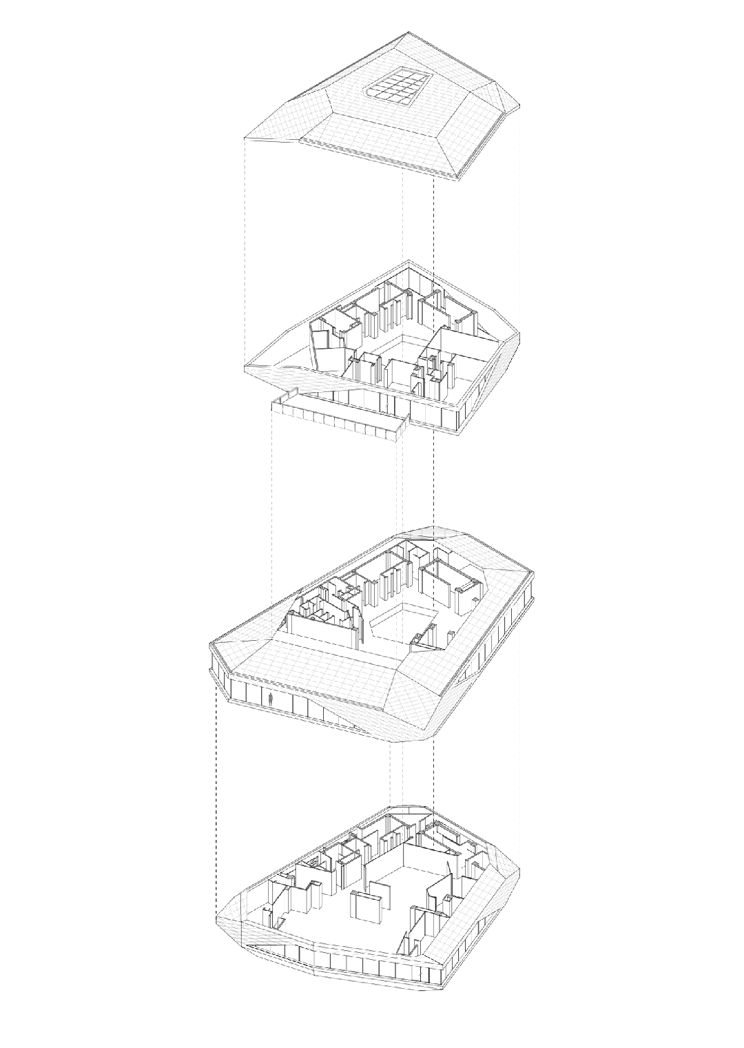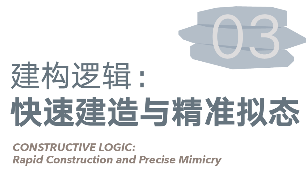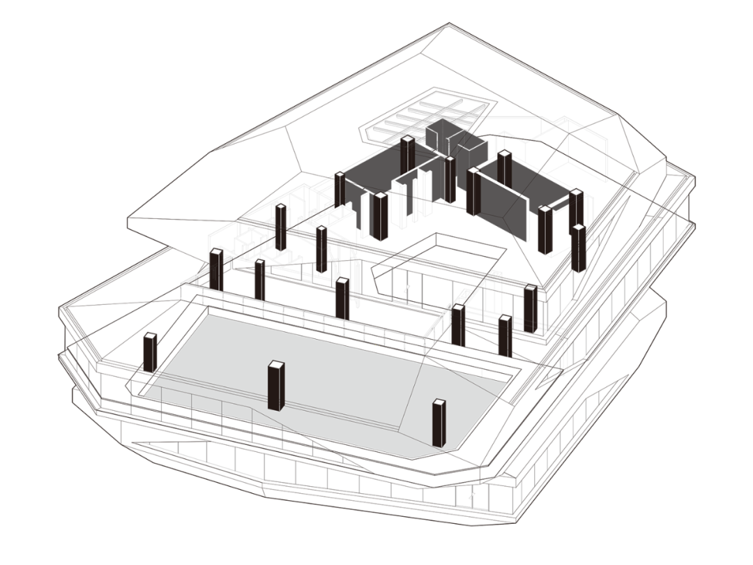 我们以“叠石”这一行为原型作为意象基础,利用三块石头堆叠、挤压、碰撞所产生的力学张力,转化为建筑的视觉与空间张力,构成三层体量:一层抬高2米,设置为这一片区所服务的社区会客厅、城市展厅等开放界面;二层为游泳、健身等为邻近社区居民提供运动主题配套,并分别通过立面洞口的几何框景向海岸线的不同朝向,打开视野;三层为咖啡、酒吧和餐饮等休闲社交业态,并通过体量的错动所形成的屋顶露台设置了观海的外摆空间。
