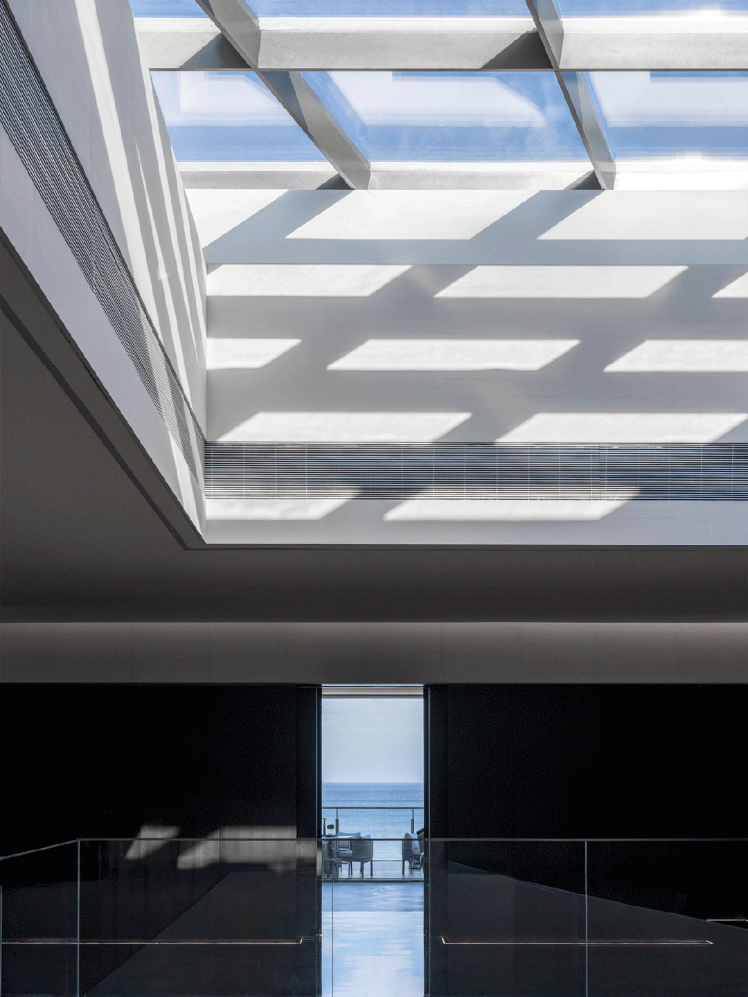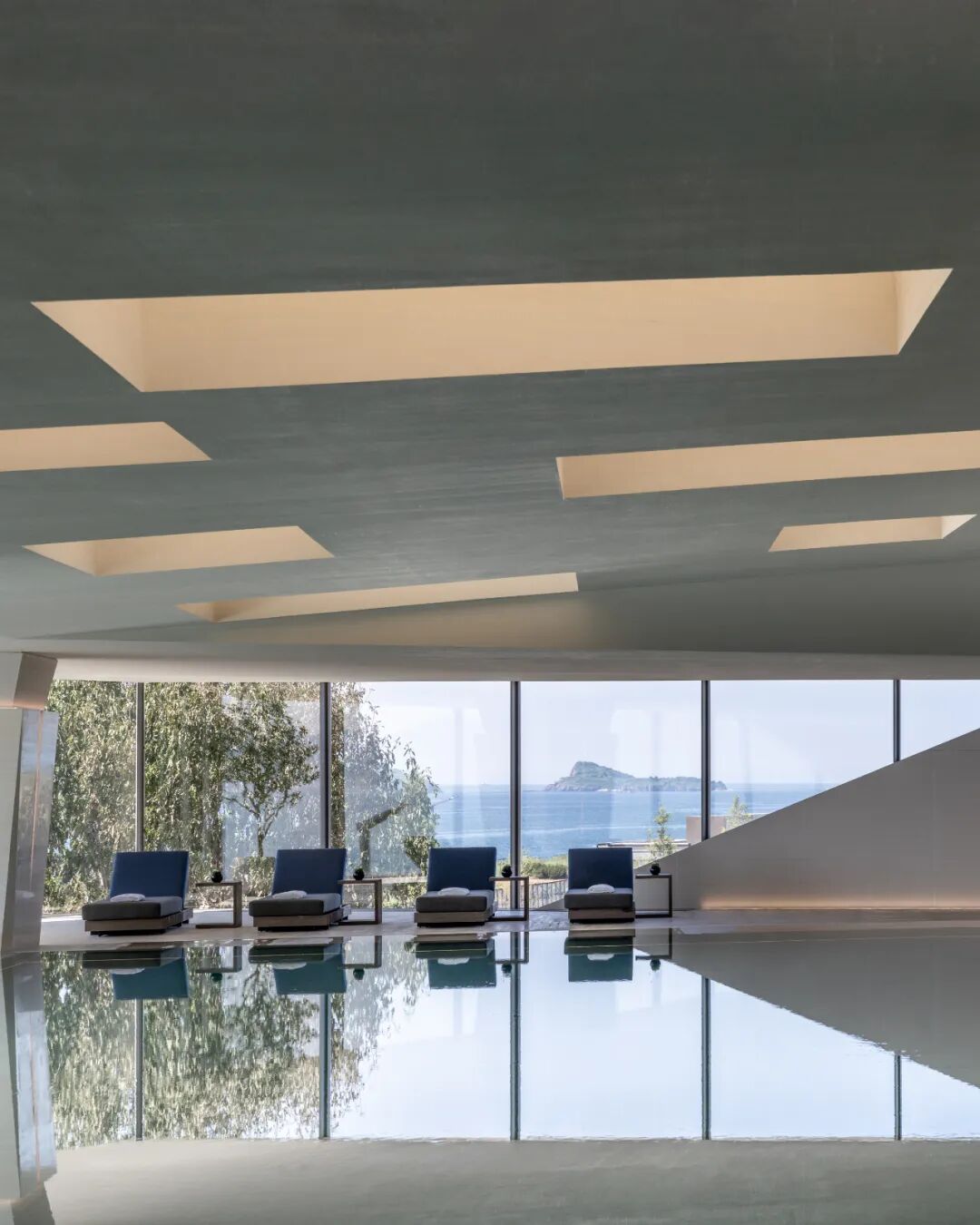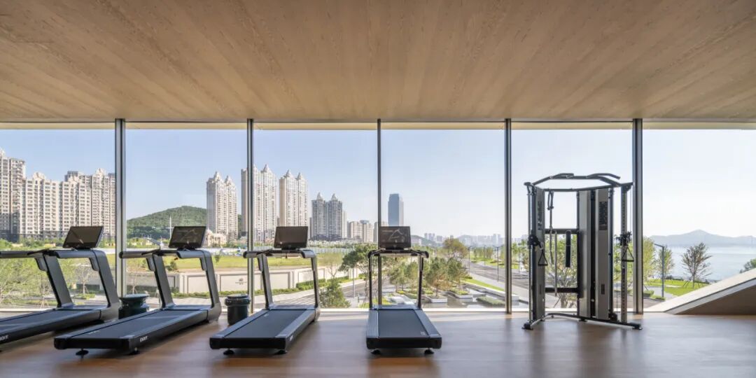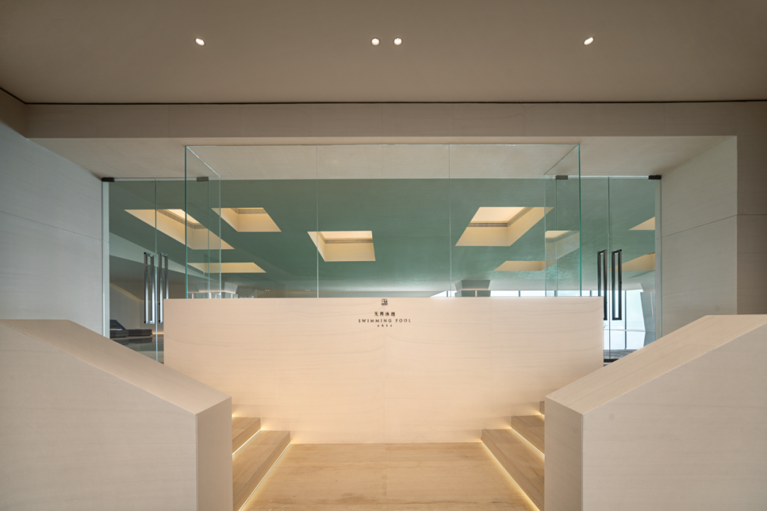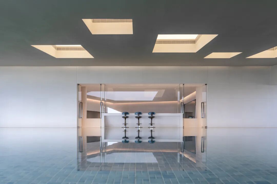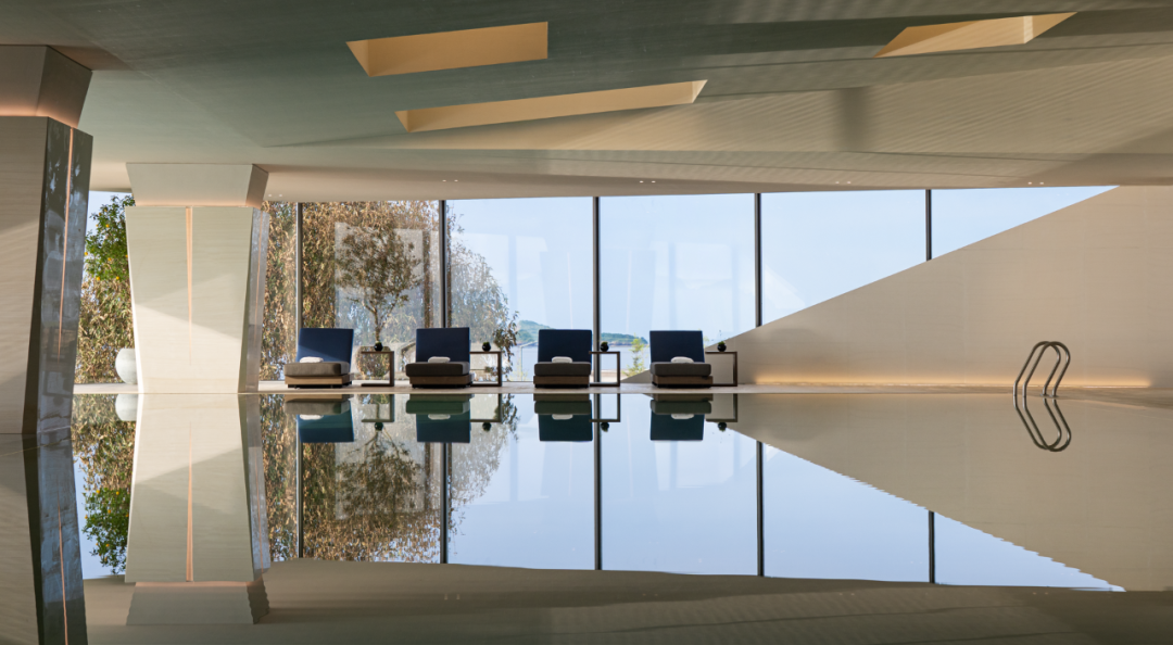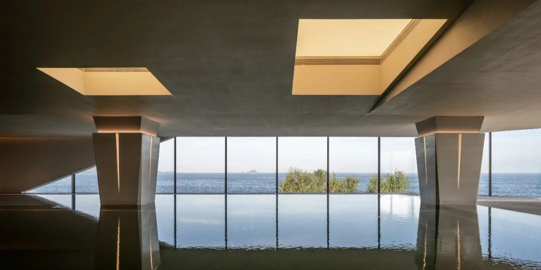 环绕:二层体量向海岸方向悬挑,并在西南与东北两角开口。西南角布置无边泳池,将视野向辽阔的海平面无限延伸,与海天相接;柱体模拟岩石肌理,吊顶灯具仿礁石孔洞,筛下柔和天光,强化空间的洞穴感。东北角布置了健身房、瑜伽室等私密运动场所。