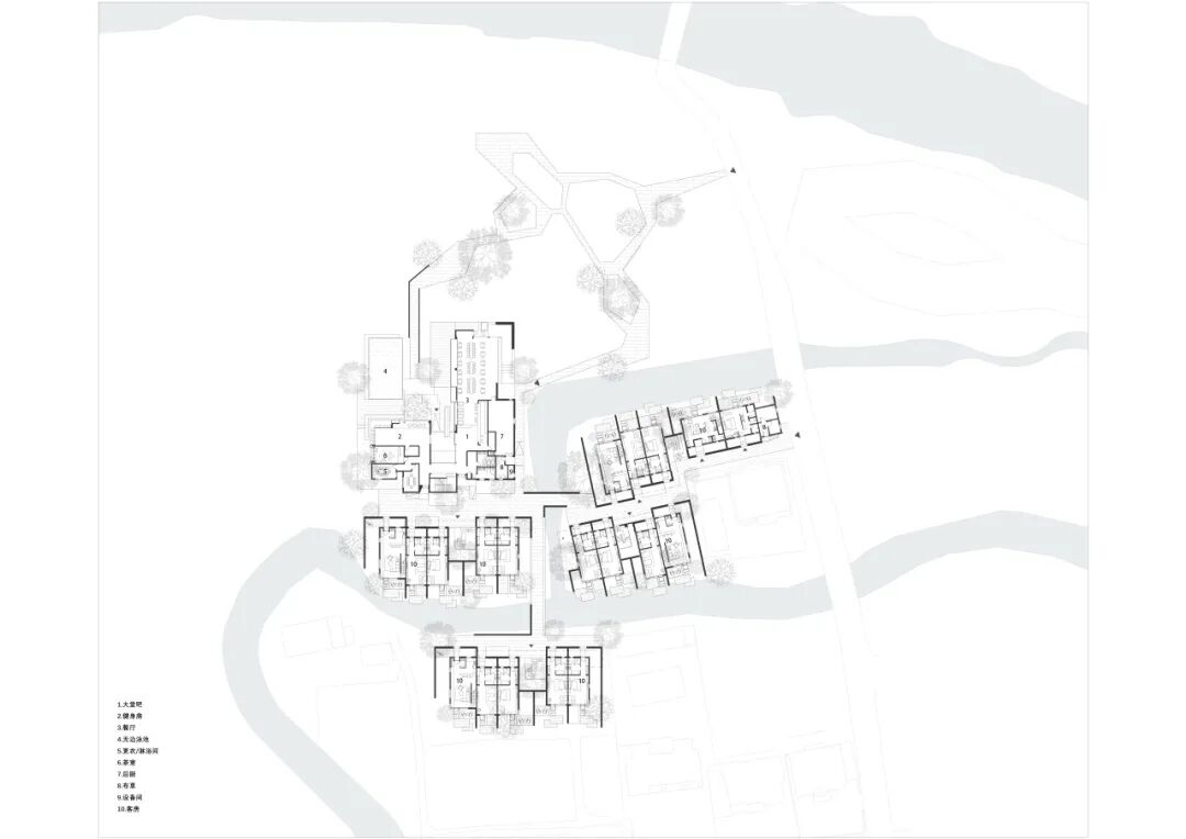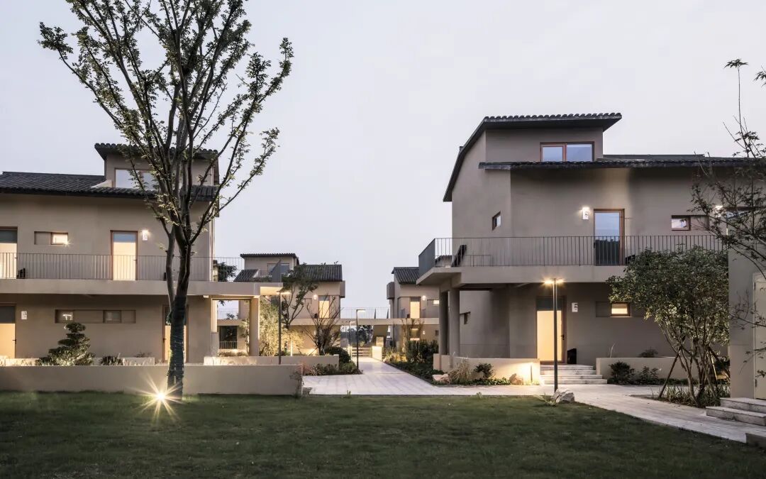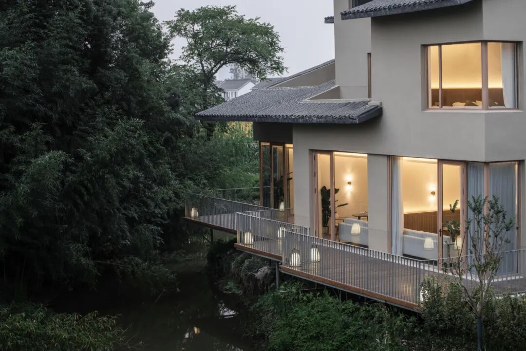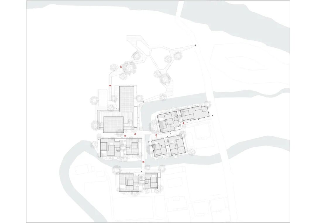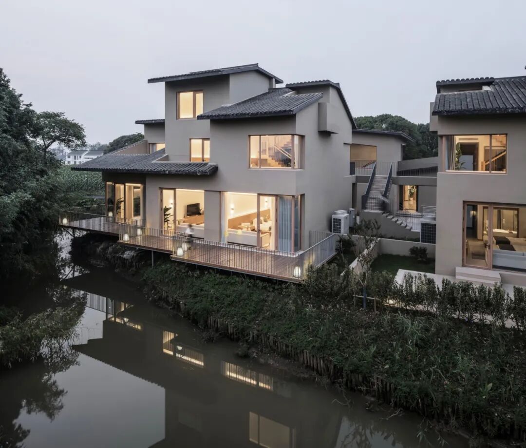 它们仿佛不是被建造出来,而是如同这片土地上自然生长的民居,沿着水系星罗棋布,最大程度地面向景观。这种消解体量的做法,是重构聚落氛围的第一步,也为接下来那场关于屋顶的“革命”铺平了道路。