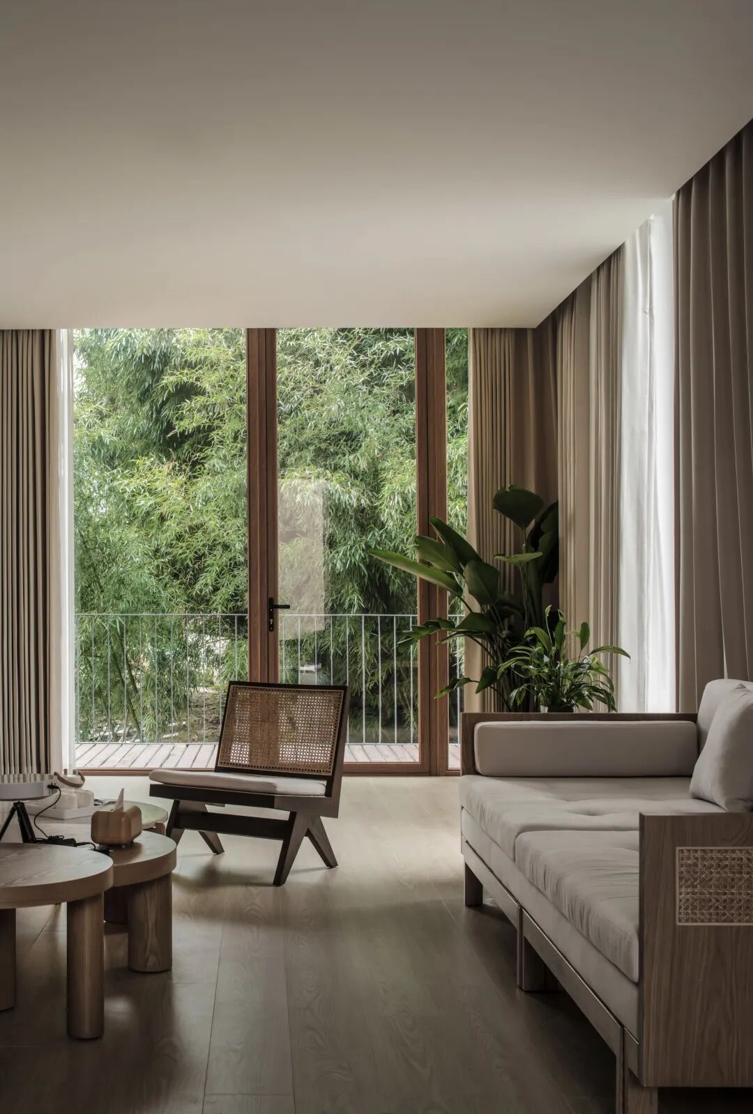 一层接待大厅拥有整面的横向落地玻璃,将无边界泳池与远方林地构成的画面完整呈现。设计师甚至刻意压低了此处的层高,在视觉和体感上进行适度压缩,从而让人们在步入空间时,将注意力更聚焦于室外那幅巨大的“自然画作”。