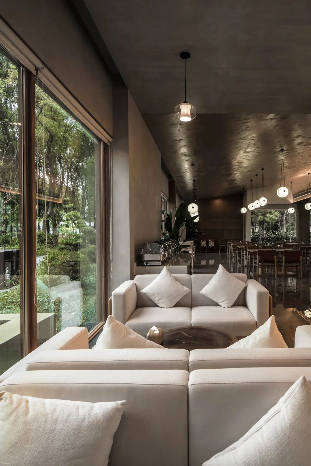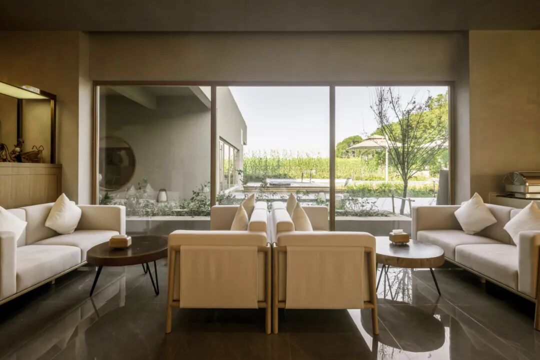 “飞檐折叠”的理念,在公共接待区得到了另一种形式的延续。与客房区的“散”不同,公共区以线性的体量展开,以一种谦逊而有效的姿态,最大程度地将风景“框”入室内。
