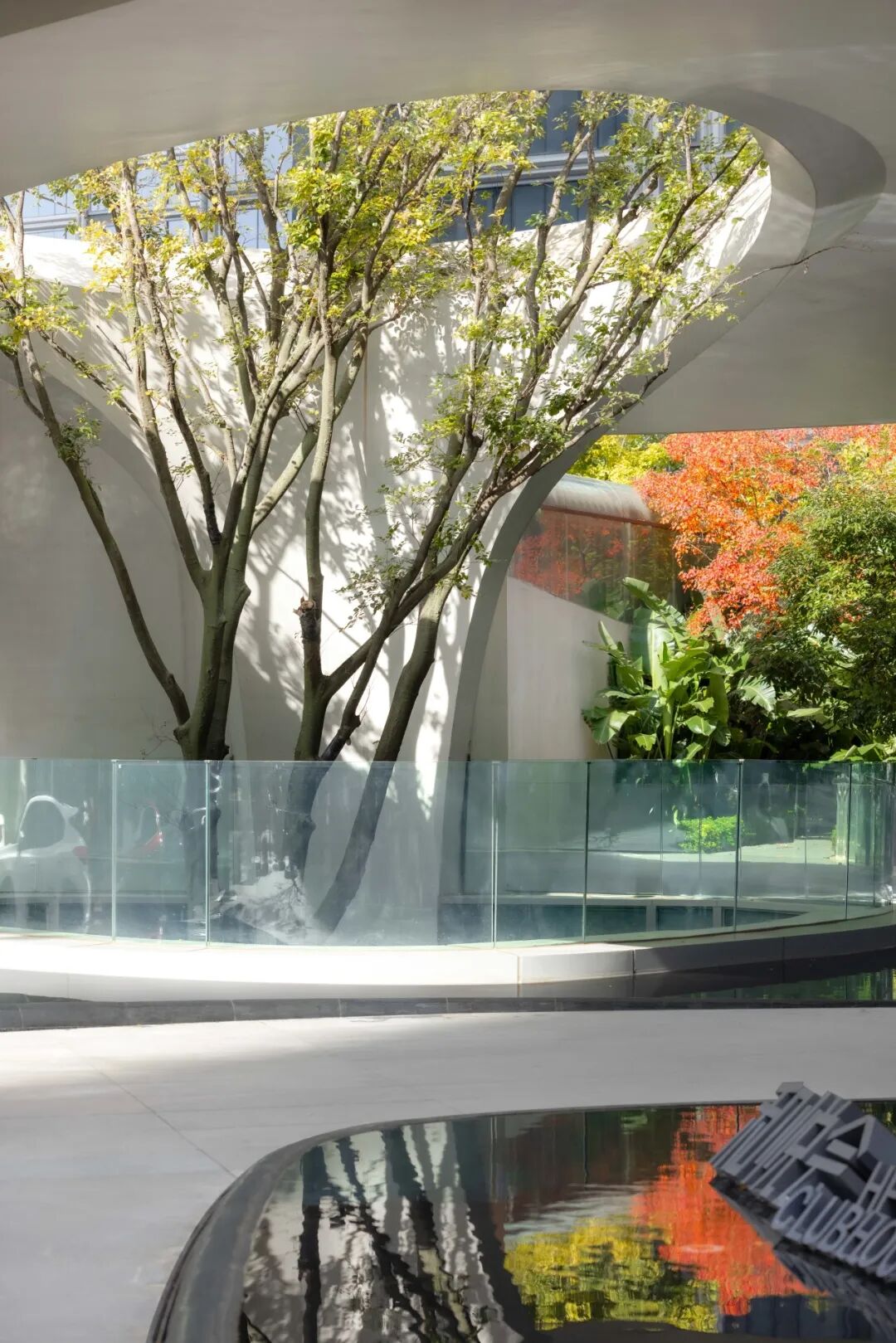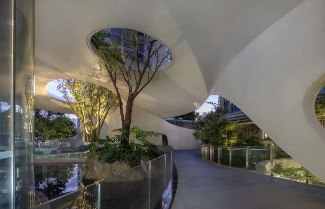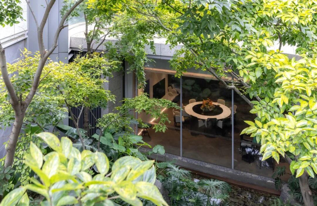 这里不是浓荫蔽日的深林,而是光影摇曳的林下序曲。树木轻盈舒展,阳光穿过枝叶,洒下一地斑驳灵动的光点。我们在不同高度种下乌桕空间主题乔木,让他们在建筑中生长出来,错落的树冠让室内、建筑、景观串联起来,形成独特的场景感。