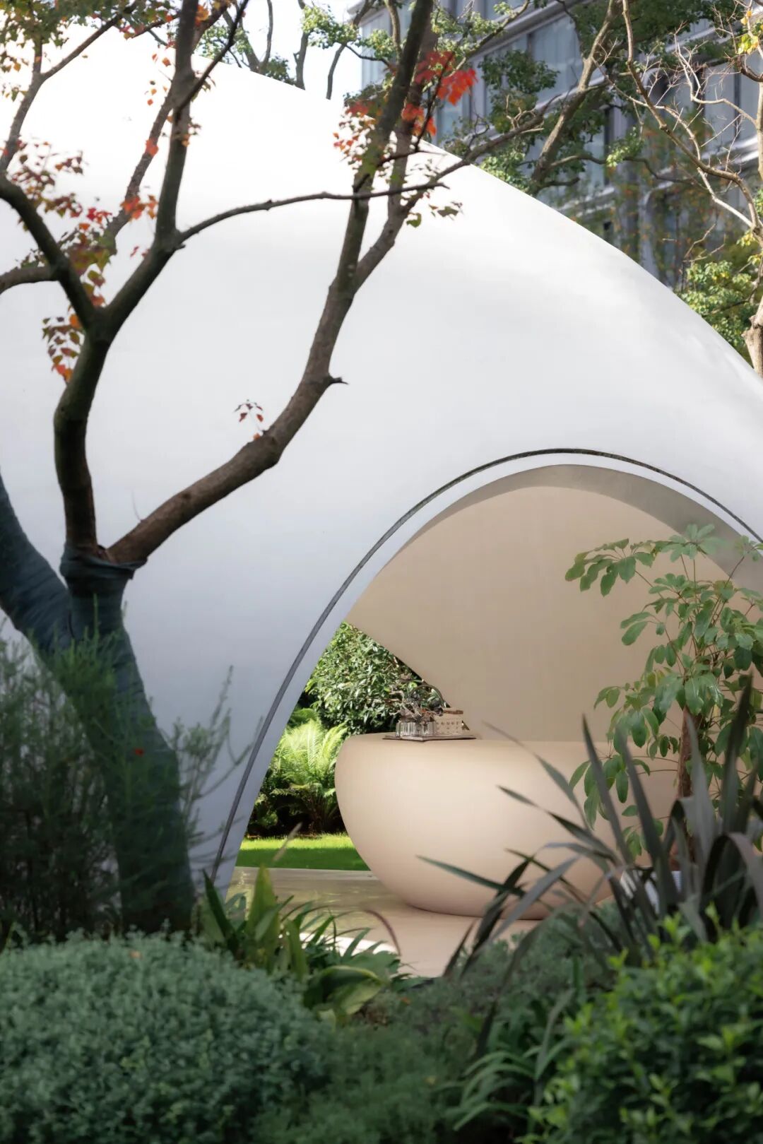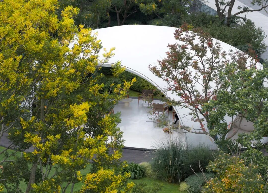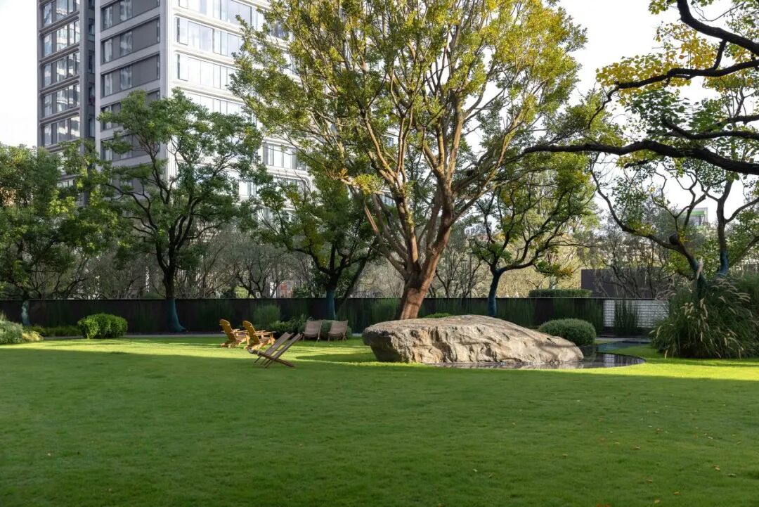 入秋后,乌桕林的树梢在自然的笔触下添加了色彩,自然之美在场地内迸发,绿植的姿态与线条,多彩与明暗交映出不规则的美。草坪上5米多的大型景石,也是自然鬼斧神工的馈赠。