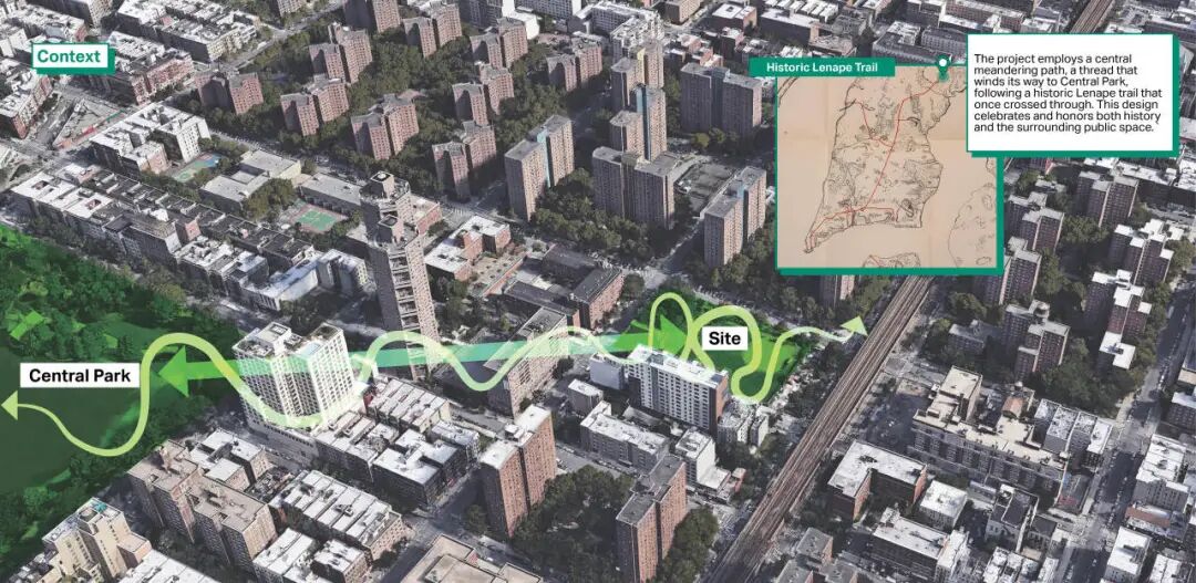 绿色小径(Sendero Verde) 以一条中央蜿蜒步道为核心,这条 “脉络” 沿着曾穿过此地的德拉瓦人古步道(Lenape Trail)走向延伸,并最终连接至中央公园。三栋独立的建筑沿步道两侧排布,自然围合出中央庭院。庭院顺势向不同高度的空间延伸,为打造特色场所创造了条件。