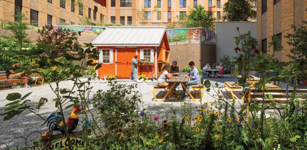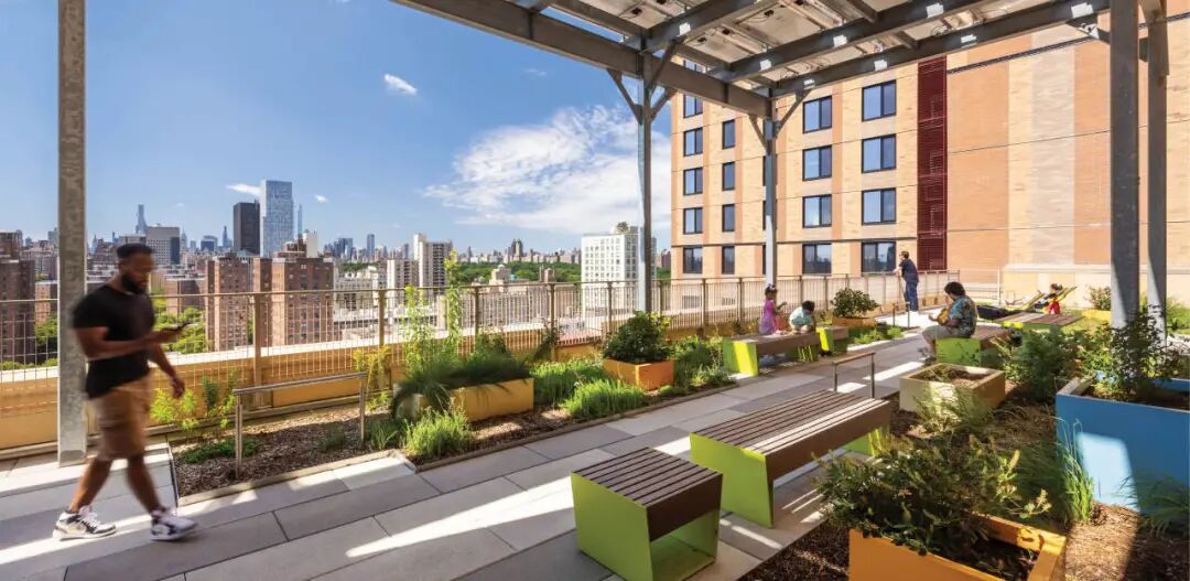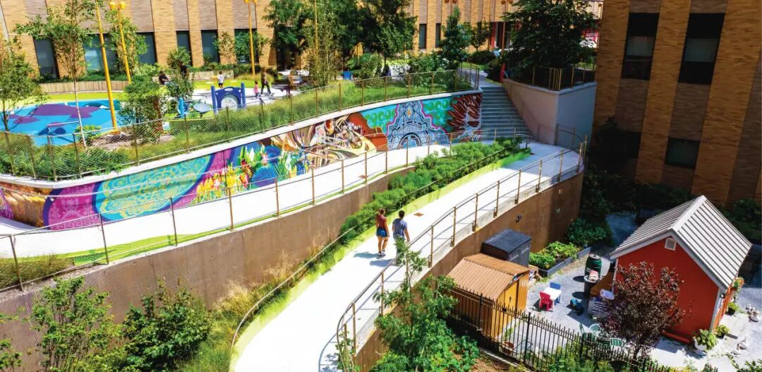 项目的中心是一处占地半英亩的屋顶庭院 —— 这片共享绿地略高于街道,为人们营造出宁静又安全的空间。庭院里既有适合轻声交谈的私密角落,也有供居民锻炼、嬉戏的互动区域,更设有一处带表演台的宽敞广场,社区集会、文化节庆和艺术演出常在这里举办。