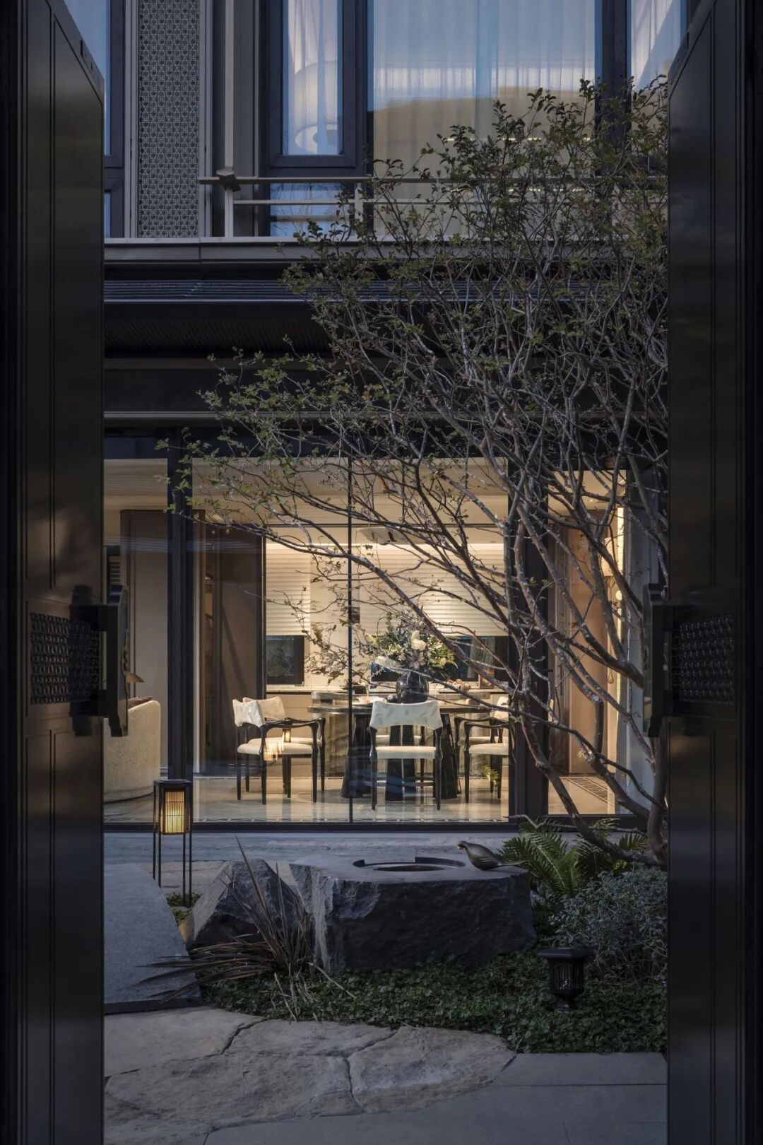 南侧独立庭院,是合院户型的灵魂:客厅、主卧等核心空间都以大面积落地窗朝向庭院打开,将湖石的叠嶂、汀溪的水声、雅枝的绿意,悉数纳入室内。踏着青石板阶入户时,湖石的叠嶂挡住了外界的喧嚣,只留汀溪的水声,将入户仪式感,拉到极致。
