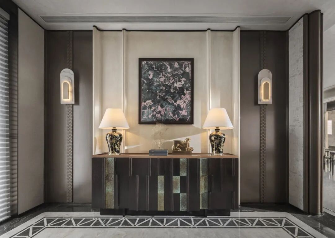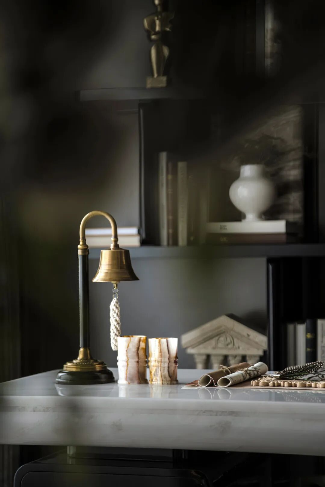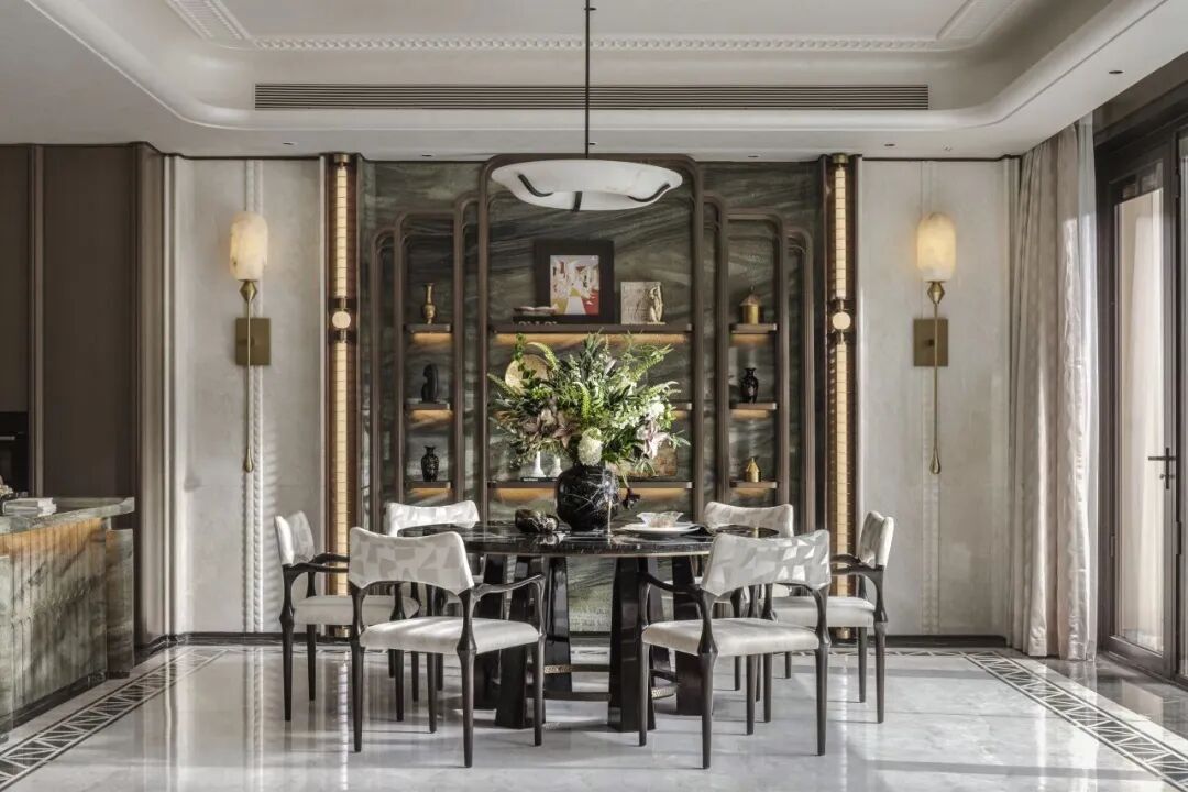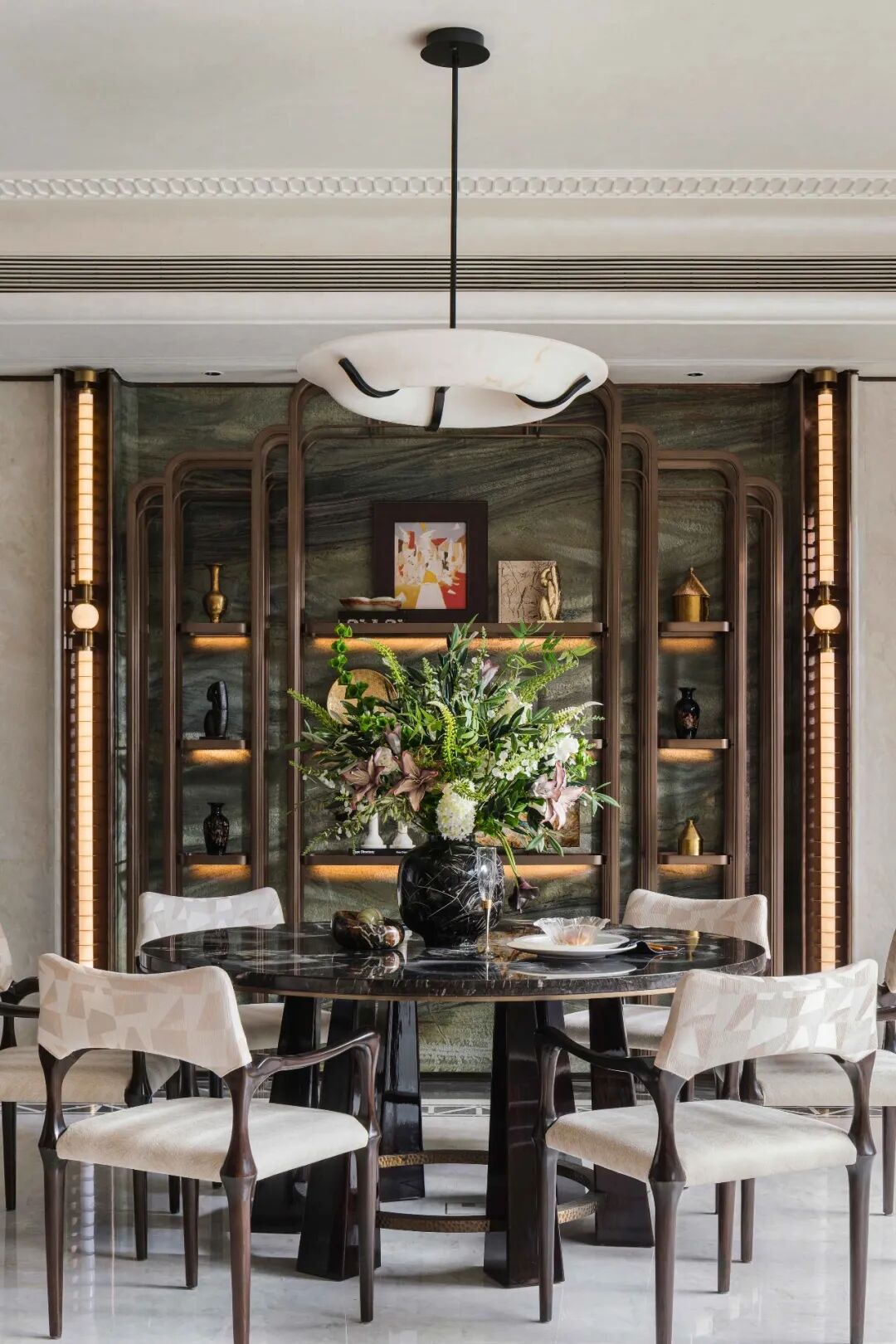 餐厅的艺术氛围,是海派东方的热烈具象:墨绿色奢石作底,暗金线条游龙般勾勒描绘出一面收藏品艺术墙。定制化设计的玉石壁灯与金色托柄相辉映,成为整个餐厅空间的点睛之笔。对称的排布方式正是面对会客客厅的空间对景,四方均衡的比例里,藏着东方造景的“留白”哲思,也藏着餐桌礼仪的规整。