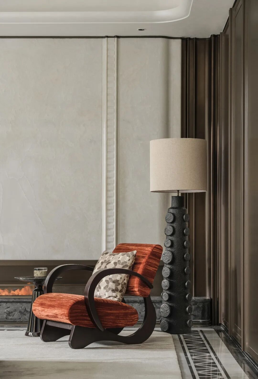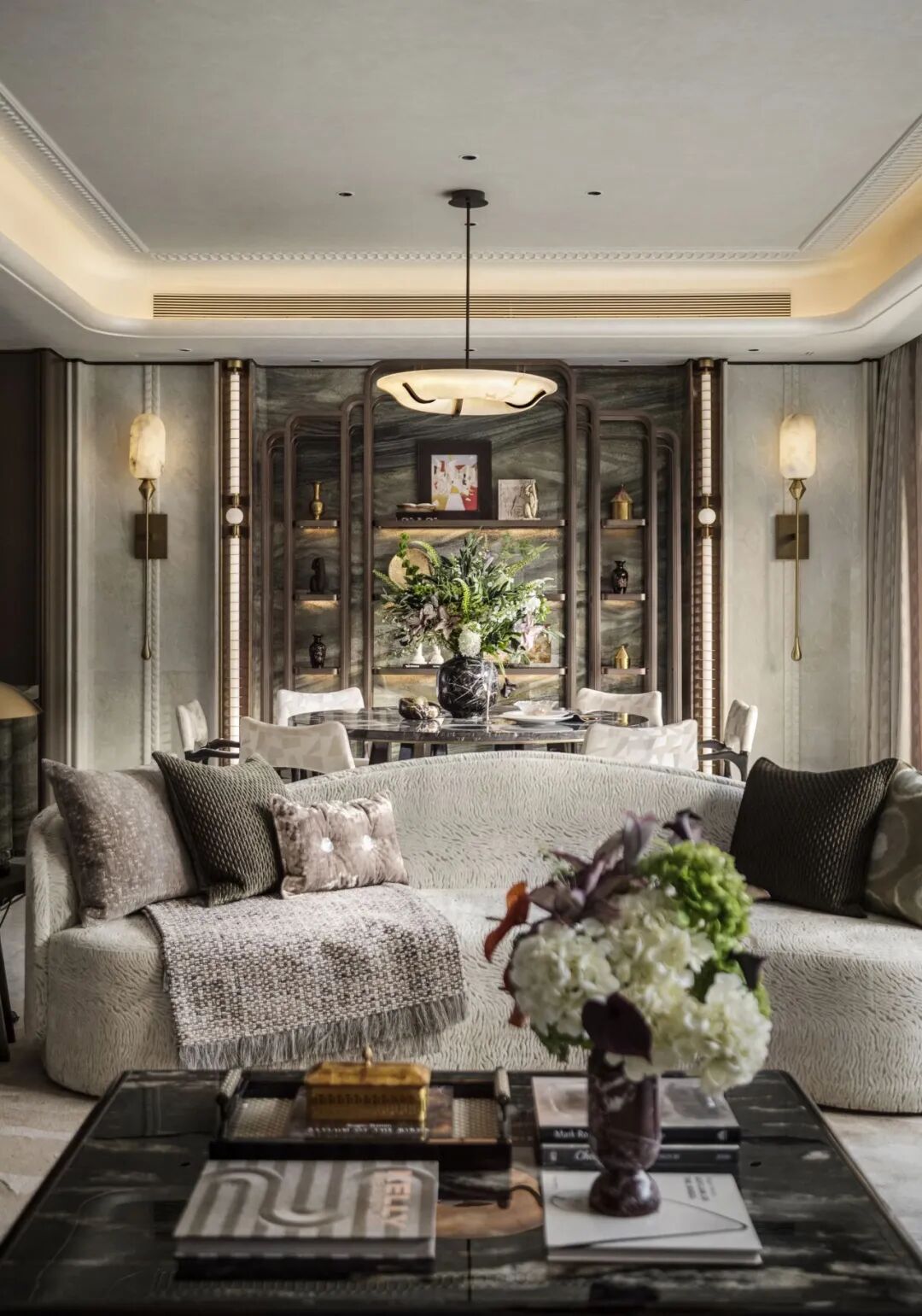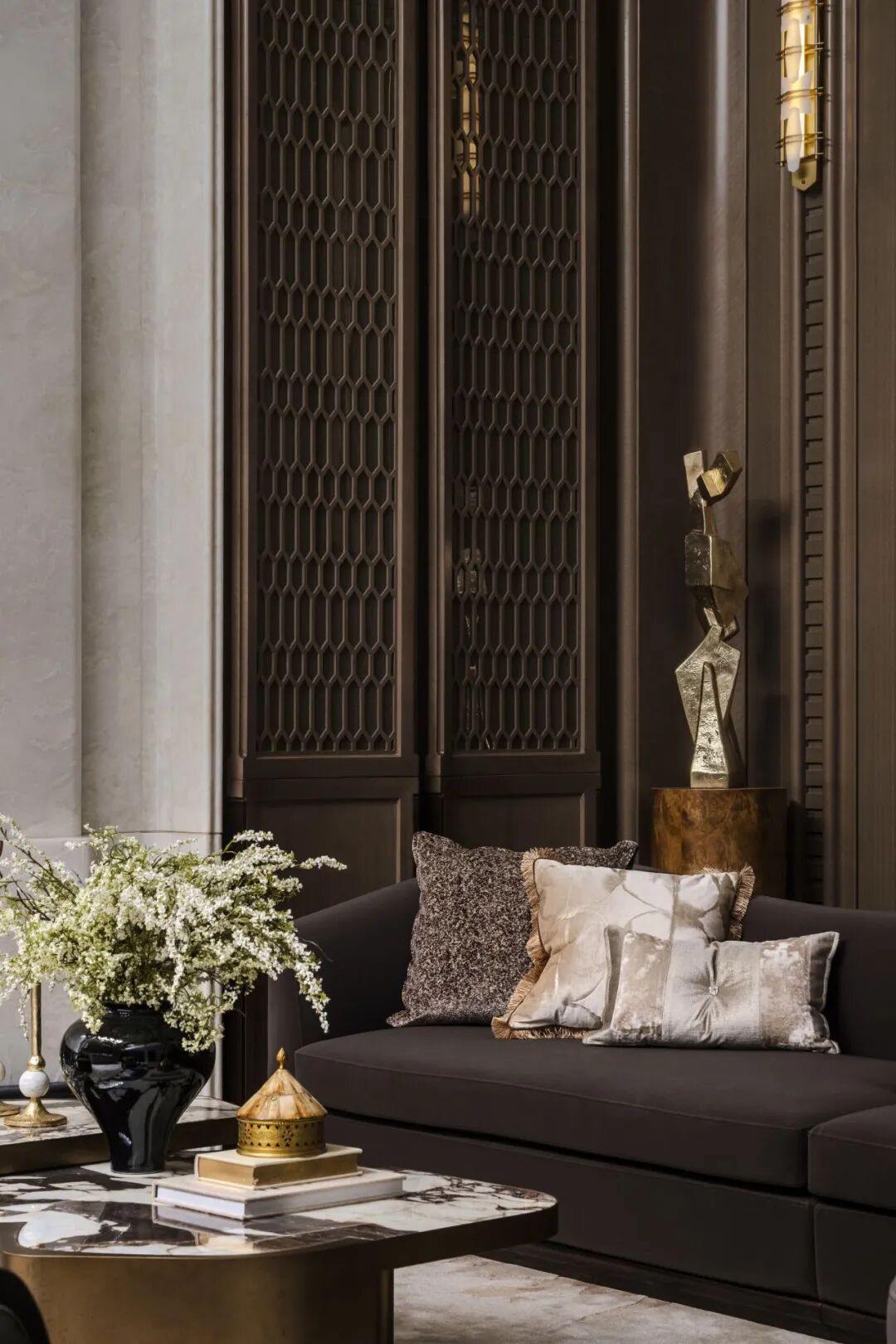 米白色莹润玉石大理石的墙面与深棕实木的温厚肌理撞出一片静雅,现代主义柔绒沙发与古典方几彼此衬映,将东方的静与柔,揉成一室的和美松弛。