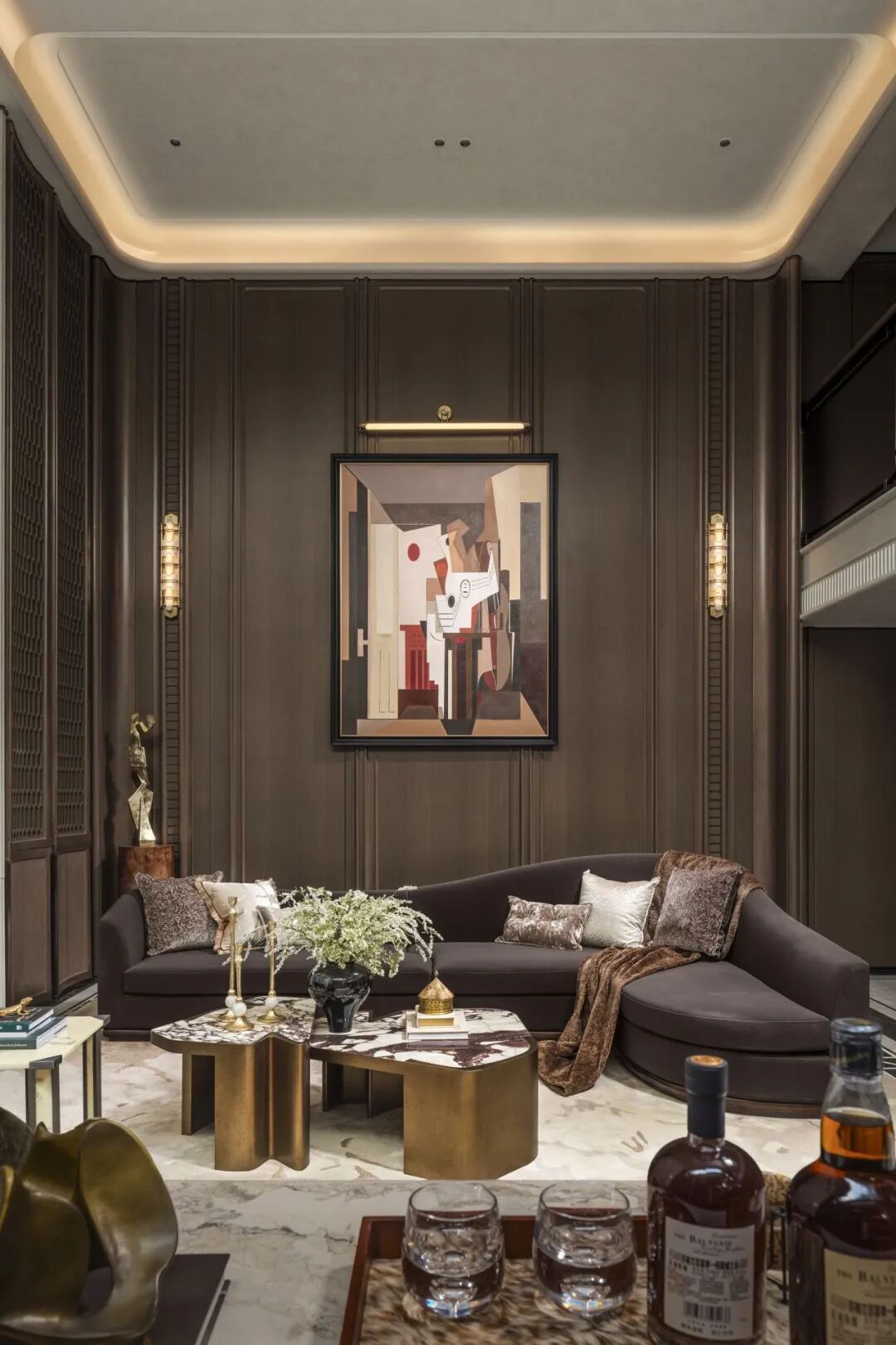 酌饮、品茄、派对......更加私人化的需求被放置在了地下一层的会客空间。穿过跃层玄关,地下会客厅是高挑、宏阔的一体空间。水吧台的玉石灯柱随酒柜一同不断向上延伸直至顶部天光,玉石大理石墙壁与深褐木和谐相接,并勾勒出垂直落下的装饰线条。