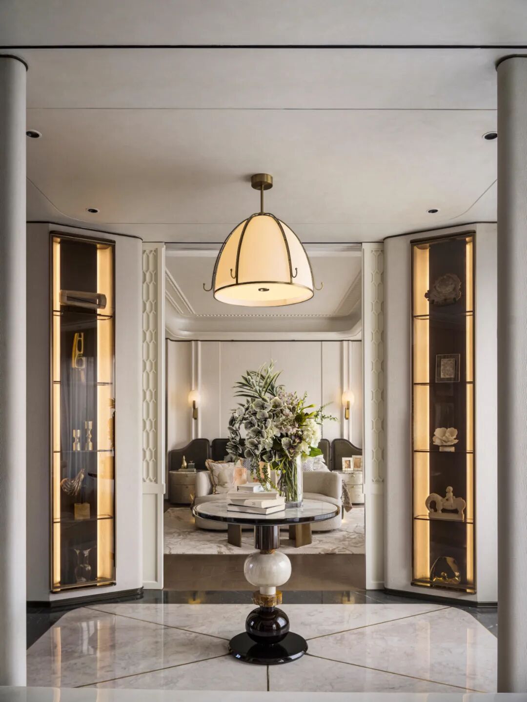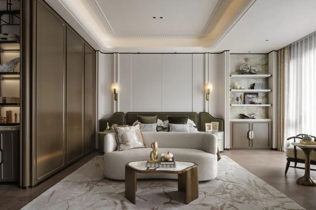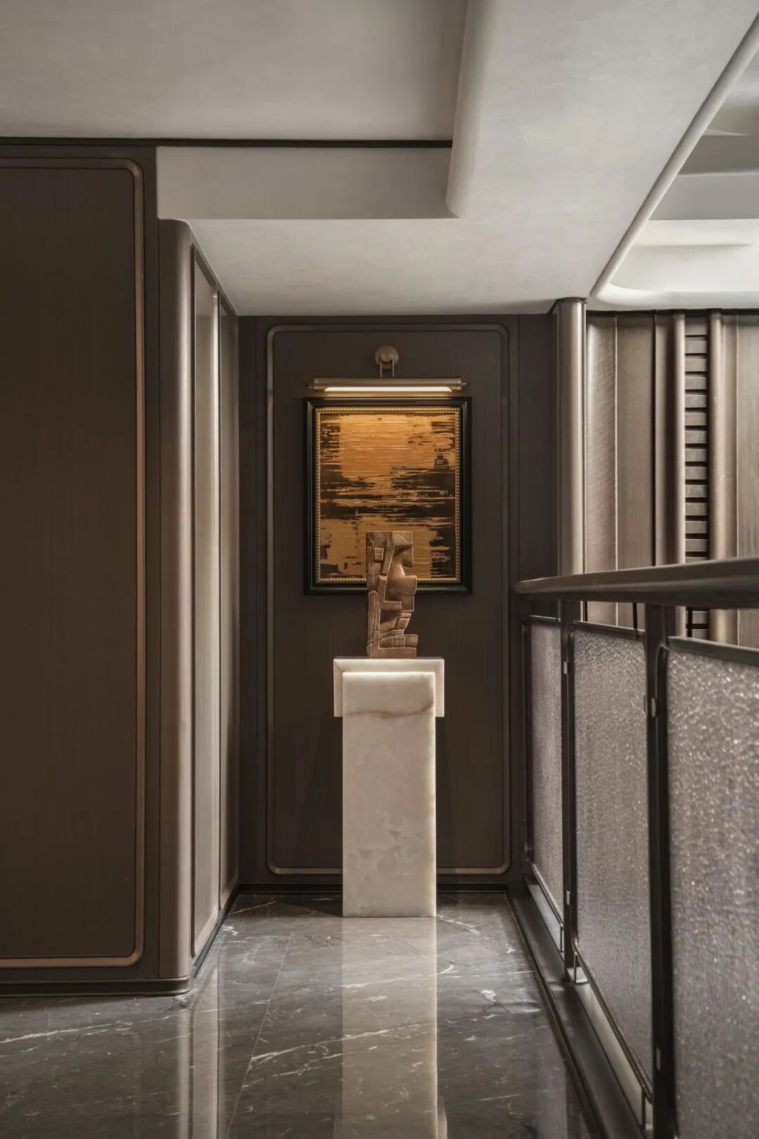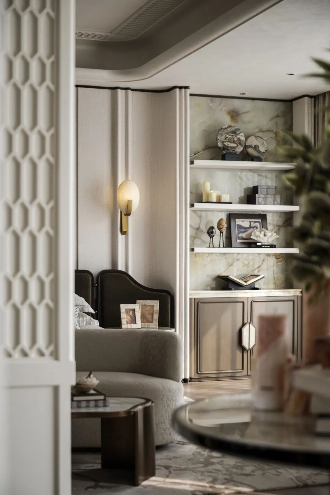 作为三层主卧区的空间枢纽,主卧玄关藏着东方造景的“藏风纳气”哲思:中央的大理石圆桌与拱圆吊顶灯形成上下呼应的对称,四边的艺术窄墙自然围出八扇界面,把横纵视线轻轻收拢;拼色大理石嵌着细铜条,与书房和卧室形成隔离区分。如此便完成了室内与阳台、主卧与书房、私域与半公共区的对景构图,每一步的动线里,都藏着空间的秩序感。
