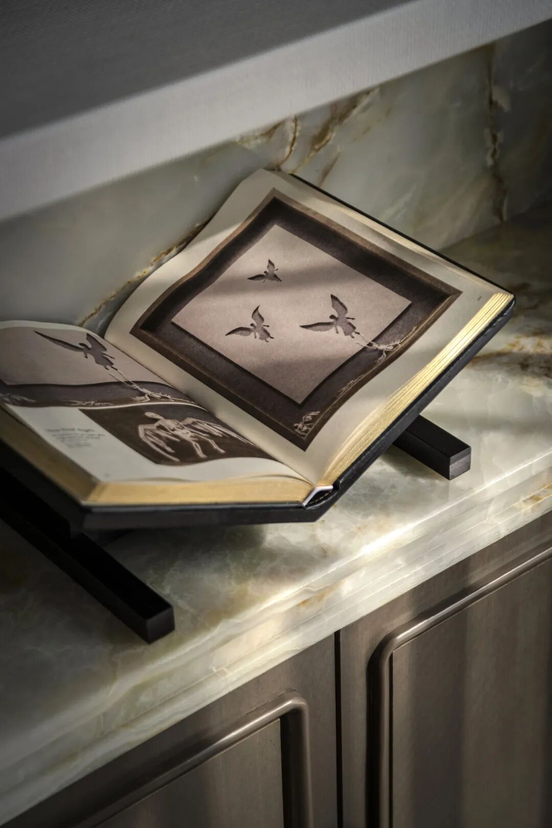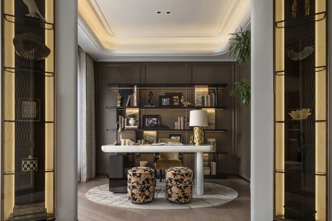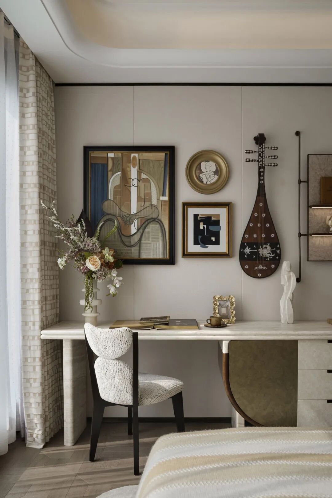 书房的气质,是东方雅正与华贵的相融:莹泽的玉石台面架在深棕漆木的书桌上,两种材质的肌理碰撞出规整的几何韵律,恰好成为主卧玄关与卧室的视觉对景。花鸟刺绣的软包椅落在空间里,如同一帧工笔小品,为冷调的华贵添了几分鲜活的雅意,连翻书的声响,都带着墨香。