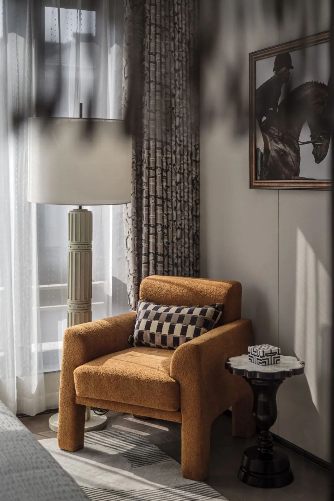 宁静、淡雅中透露出奢致,是卧室空间整体主基调:张弛有度,温柔恬适。主卧空间按照主席套房标准,配备完全,且在落地窗边和床尾分别设置了私属起居角。或是倚在院景旁阅读,或是半躺在长沙发上小酌,充分满足主人归家后的多元放松需求。