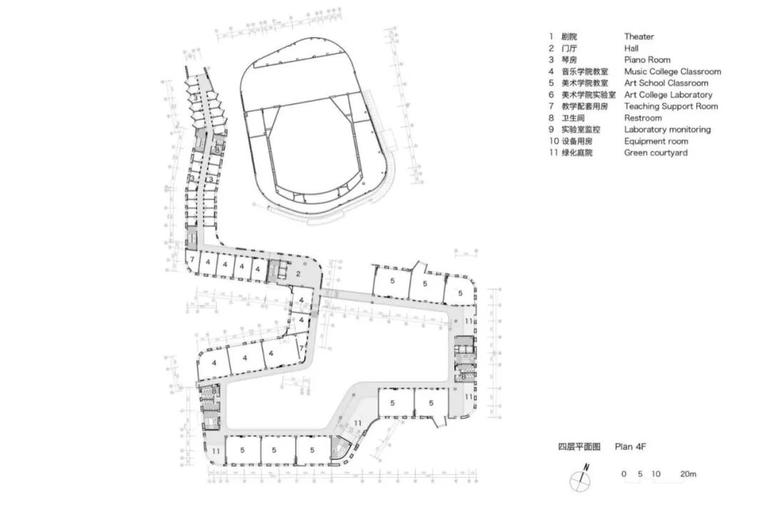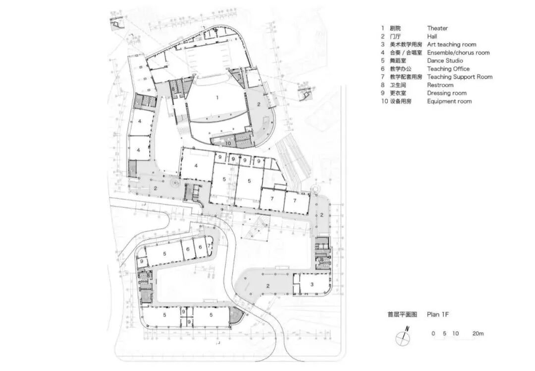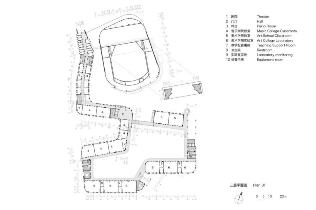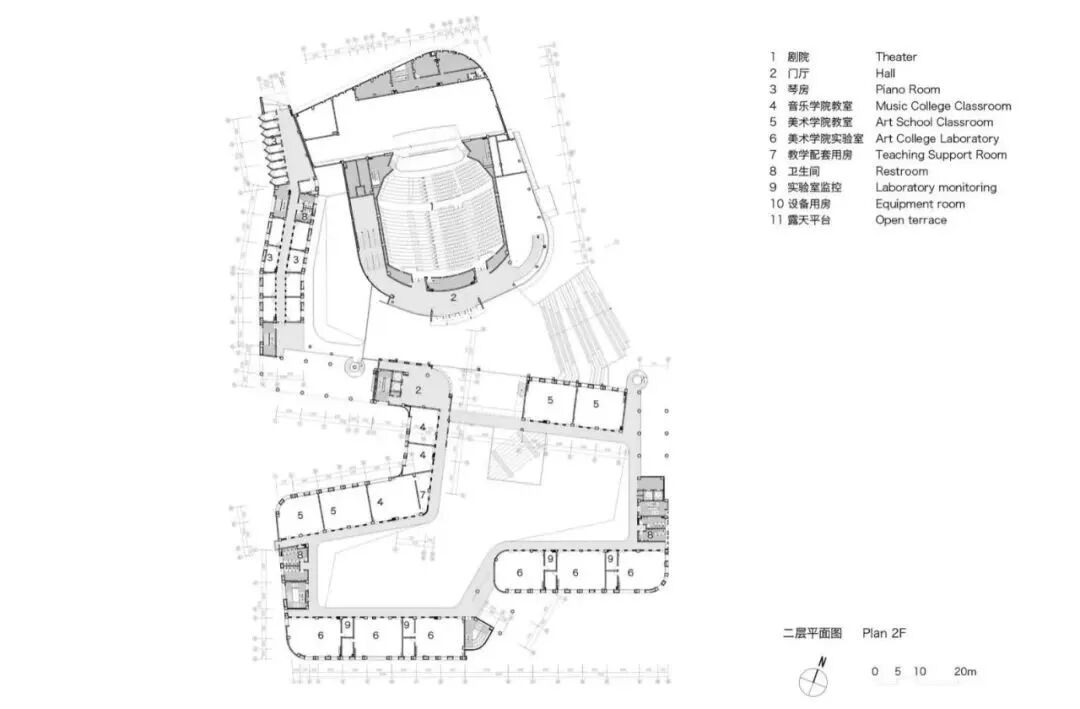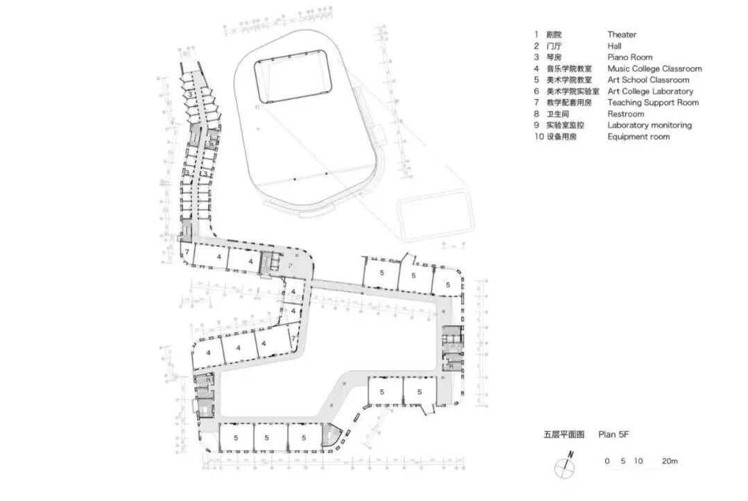 设计通过对文化艺术理念的探索和周边校园空间环境特征的提炼,形成富有艺术特色的建筑形态。音乐与美术用房体量犹如一条漂浮的丝带围绕着影剧院,飘逸灵动、富于艺术感,如同一条漂浮的五线谱凌于湖水之滨。肇庆学院北岭校区艺术中心一体化设计在整个校园建筑设计中至关重要,它是实现校园整体性和协调性的关键举措。这一设计理念的实现将为师生带来更加友好和宜人的校园环境,也将提高校园建筑的品质和形象。艺术中心外形采用飘带作为母题,墙面上下、水平向的韵律变化,如跳动的音符。艺术元素能够吸引人们的注意,不仅可以丰富校园文化,同时也有助于提高学生的艺术素养和审美观,为校园营造轻快氛围。色彩在空间设计中被巧妙地运用,用黄色来代表美术,蓝色来代表音乐,用红色来代表剧院,这些颜色不仅仅具有很强的识别性,同时也能够形成活跃的视觉焦点,为艺术中心带来充满生机活力的空间感受。立面设计涉及如何在建筑结构上实现律动的开洞变化,如何通过色彩处理,创造出像漂浮的五线谱般的视觉效果等。考虑绿地率、人工环境设计、内外渗透等多个方面,使得校园景观具有连续性。声学设计和视线设计充分考虑学院的教学特点和艺术要求,为学生和教师提供最优越的教育和艺术体验。确保使用者拥有最佳体验感。六层平面图 TOP ROOF FLOOR PLAN建筑:黄睿、林家奕、王钰、苏志森、李文红、吴永雄、陈明扬、何敏俊、李观楠、苗理想、李冠豪、南宇、林淑静