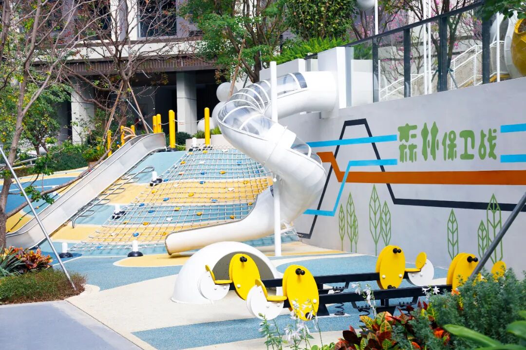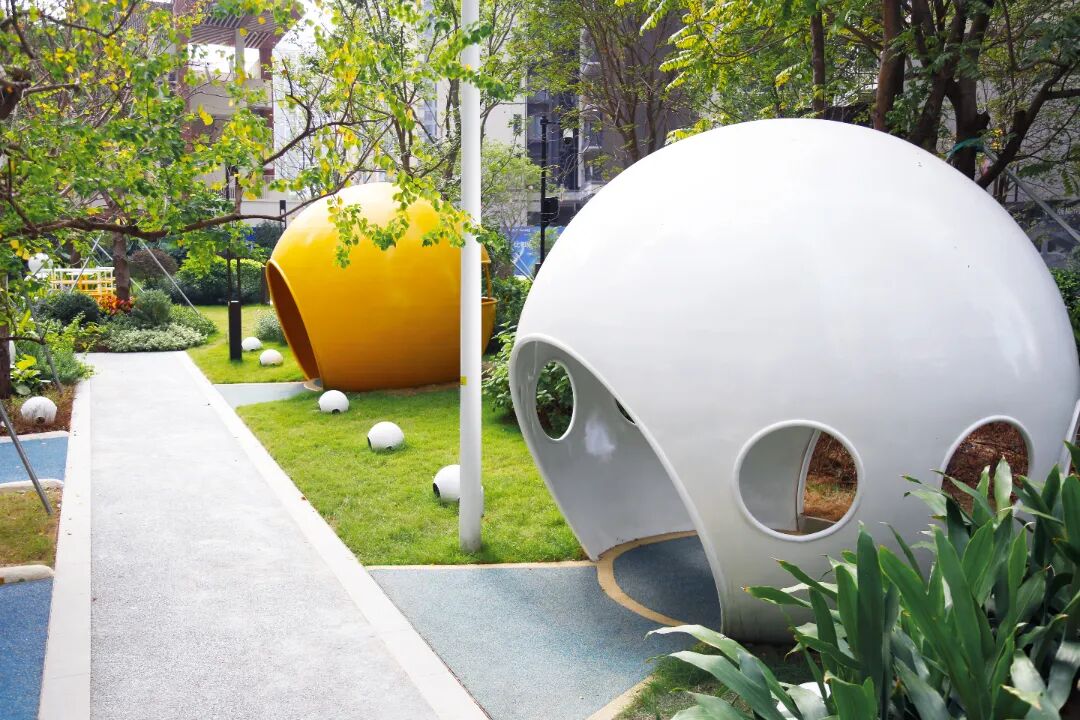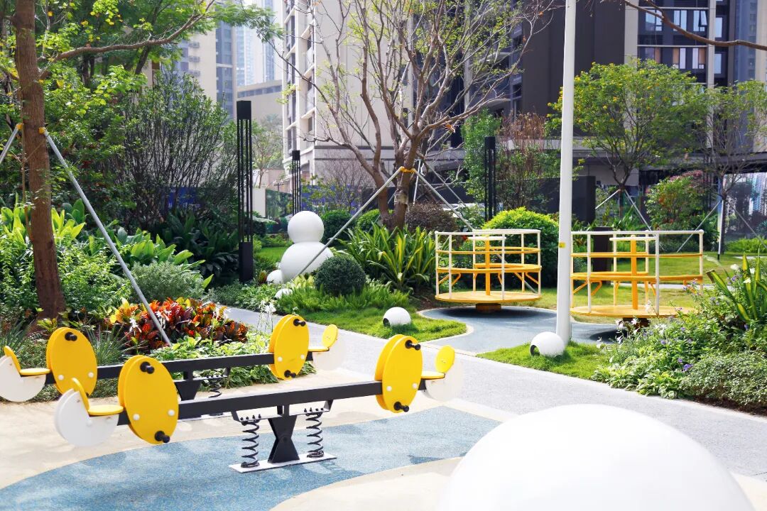 全龄活动区涵盖儿童游乐、青年健身与老年康养功能,通过配置相应设施与不同绿化植物,为各年龄段业主提供舒适的休闲环境。