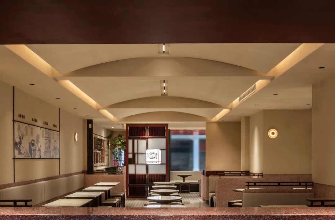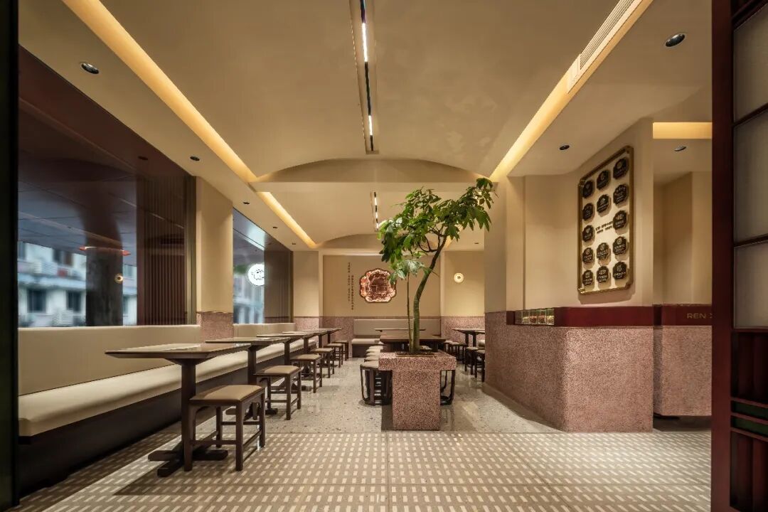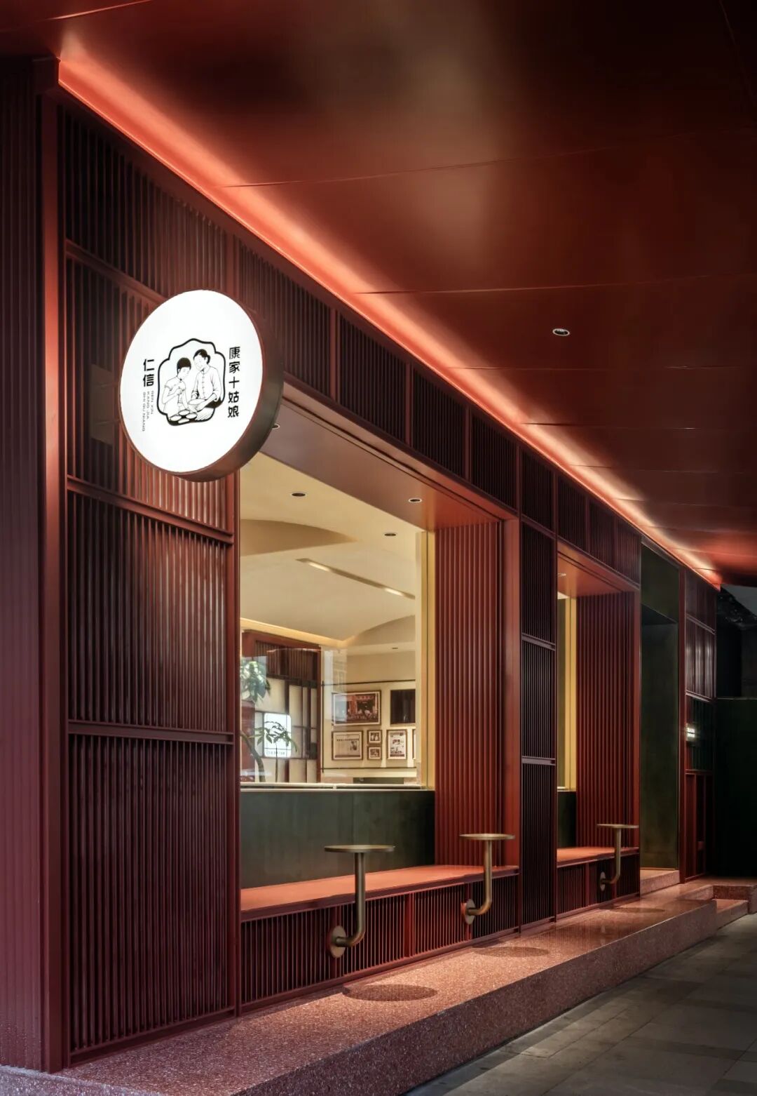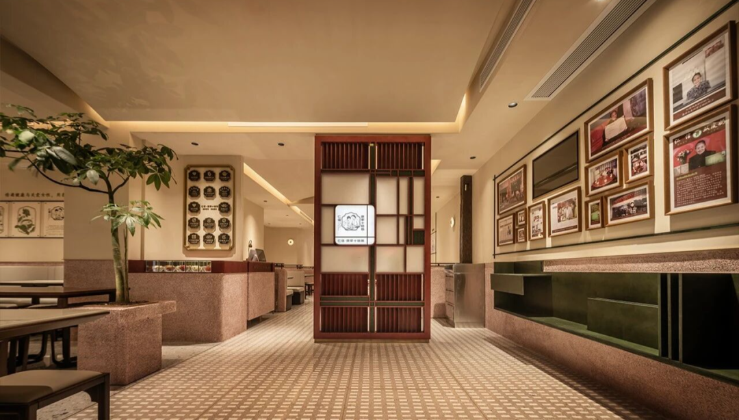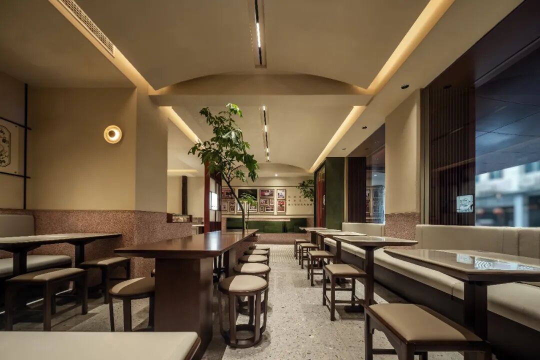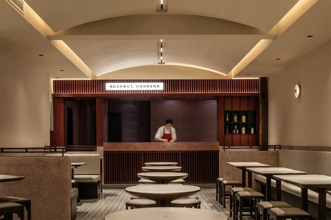 以透明设计直观呈现食材品质与标准化操作,强化品牌信任。厨房深红色瓷砖墙面融入中式韵味,与整体温润风格统一,达成功能与设计的协调。