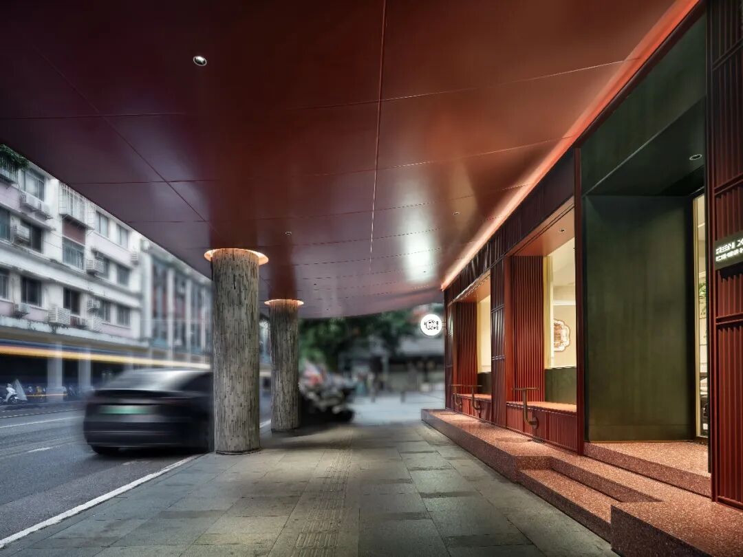 以岭南在地文化为根基,打造强记忆点外观。整体以红色为主基调,搭配多元材质构建层次:红色港式水磨石铺就入户台阶,颗粒肌理具有老广怀旧感,复刻老街质感。