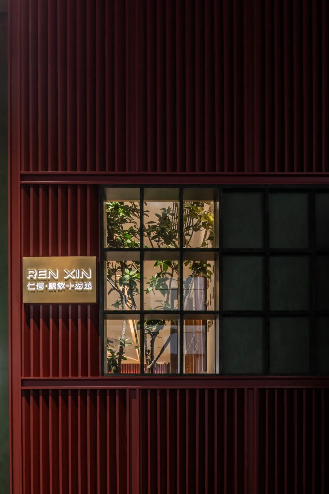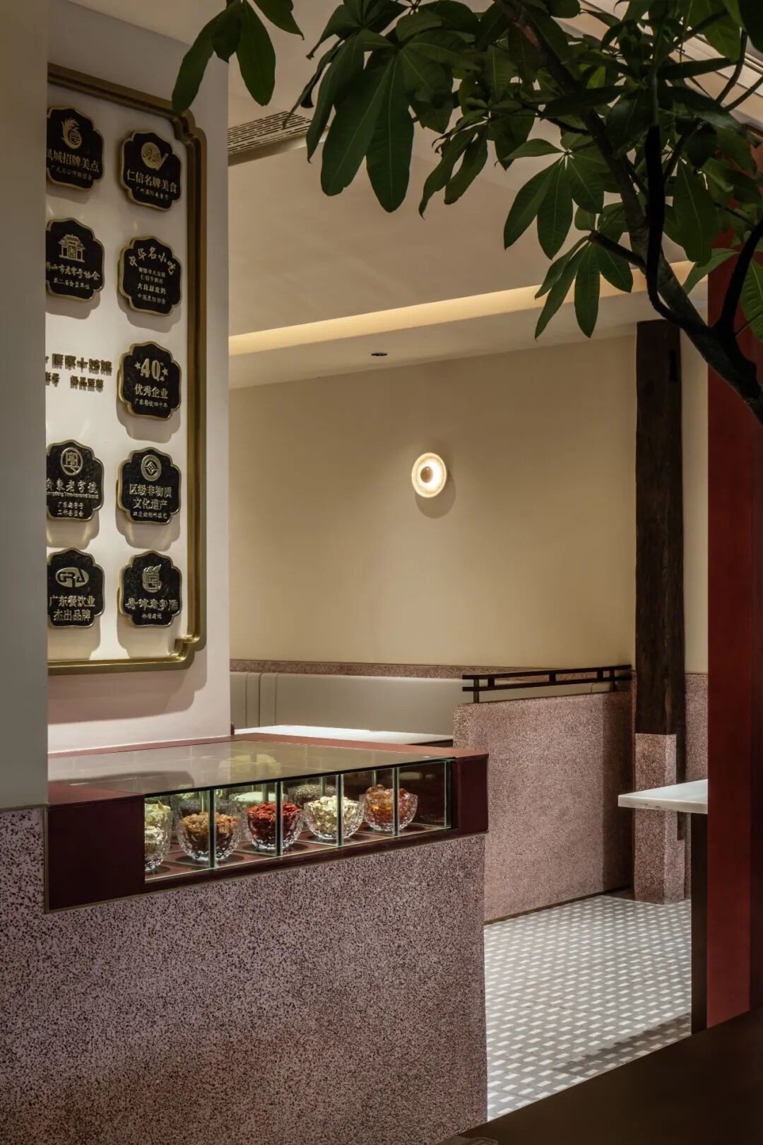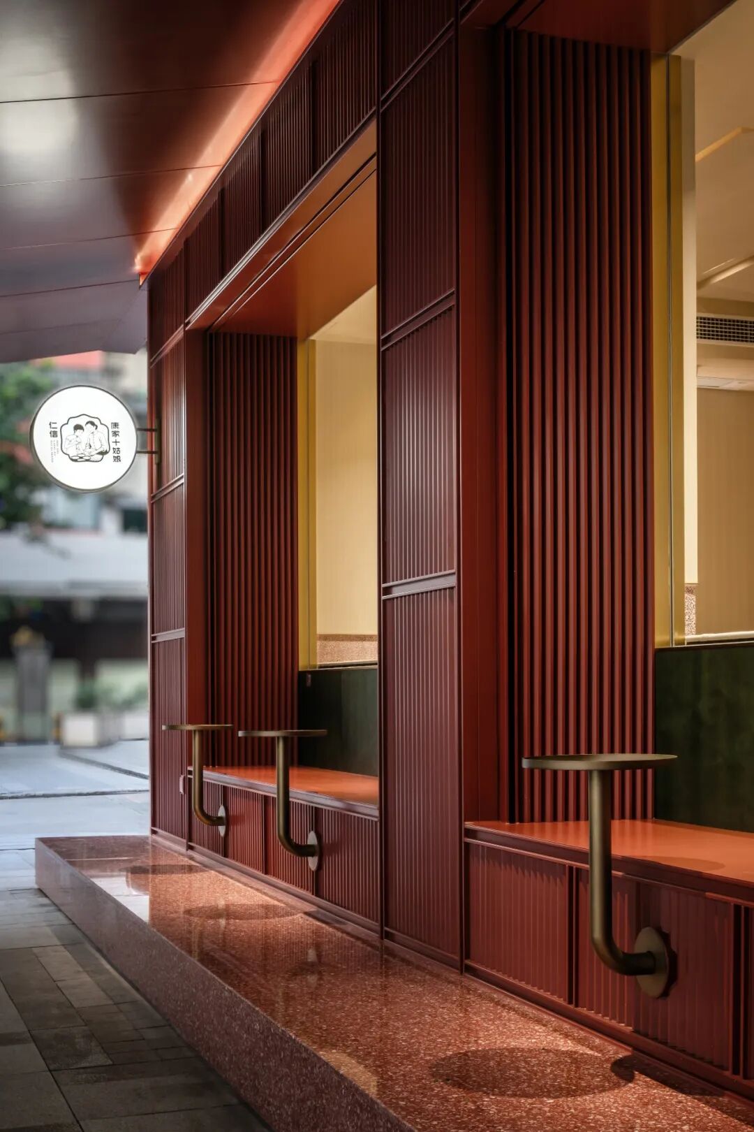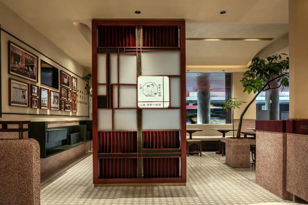 品牌标识展示设计与其结合巧妙的融合,让屏风整体具有浓厚的岭南本土人文风格。这道屏风不仅是店铺的核心品牌识别符号,更巧妙地充当了空间分区的媒介。实现前厅与内部消费区的自然分隔,构建“闹中取静”的过渡缓冲带,引导消费者完成从街区喧嚣环境到松弛消费氛围的心理转换。