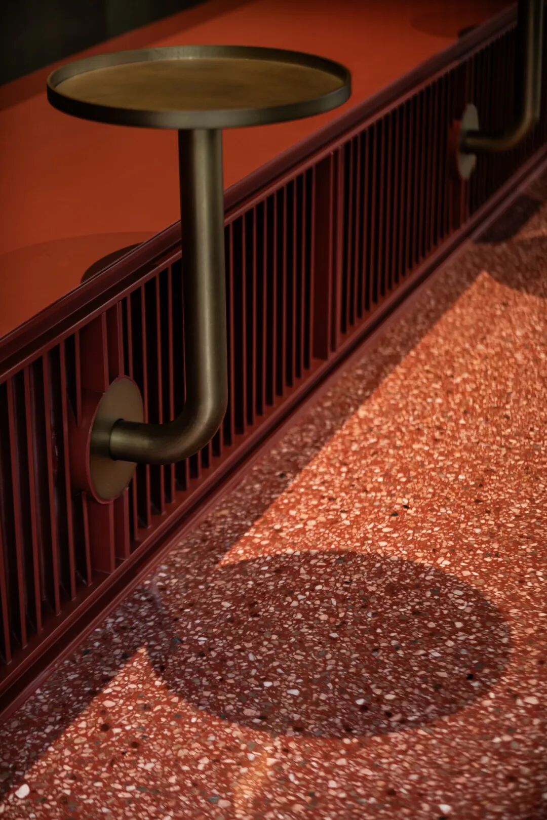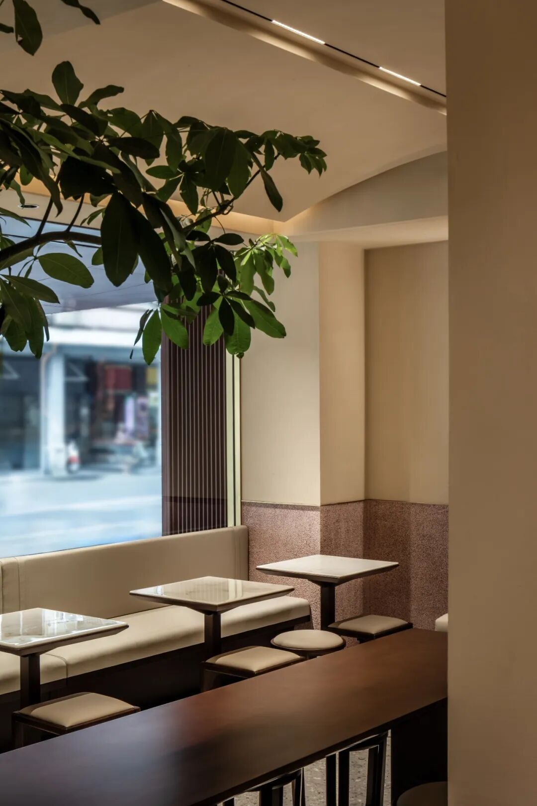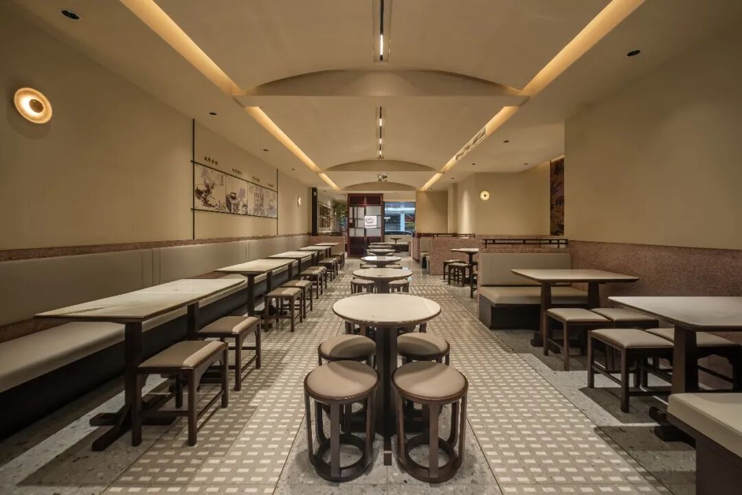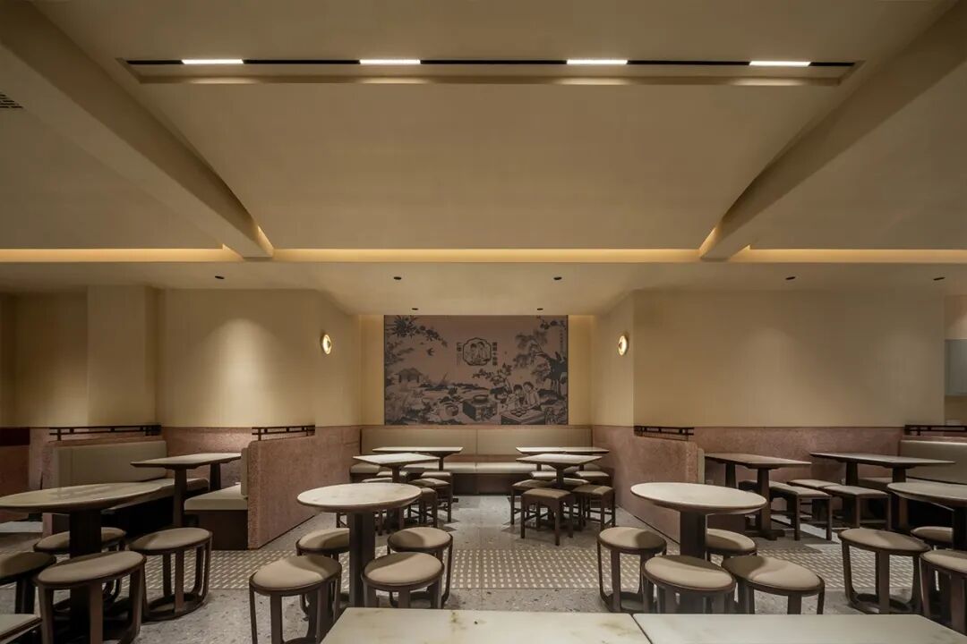 门边港式水磨石区域增设餐位,提升利用率并平衡美学与实用;金色曲线托盘边桌消解厚重感,为中式基底注入灵动,细节尽显品牌女性关怀特质。