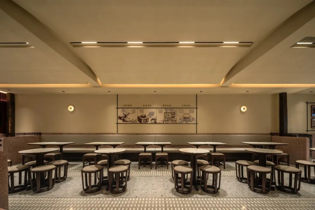 设计融入中式造园理念,以浮雕为视觉 “框” 重构乡土景象;暖光内嵌工艺柔化肌理,辅以 “养生智慧” 文字,勾连水牛奶食材与品牌 “滋养生命” 理念,赋予空间文化叙事与情感共鸣价值。