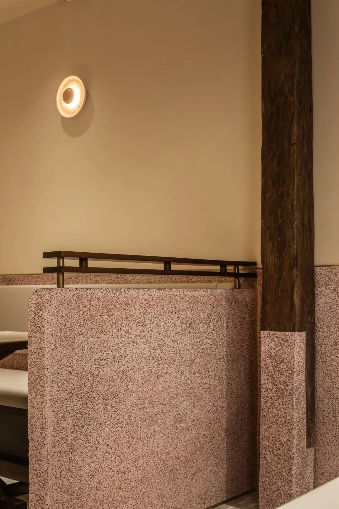 同时,水洗石的颗粒肌理与旧木柱的温润质感形成粗糙与柔和的对比关系,既还原岭南乡土空间的原生建构逻辑。通过材质的本真属性,将品牌 “质朴本真” 的调性转化为可感知的空间体验。