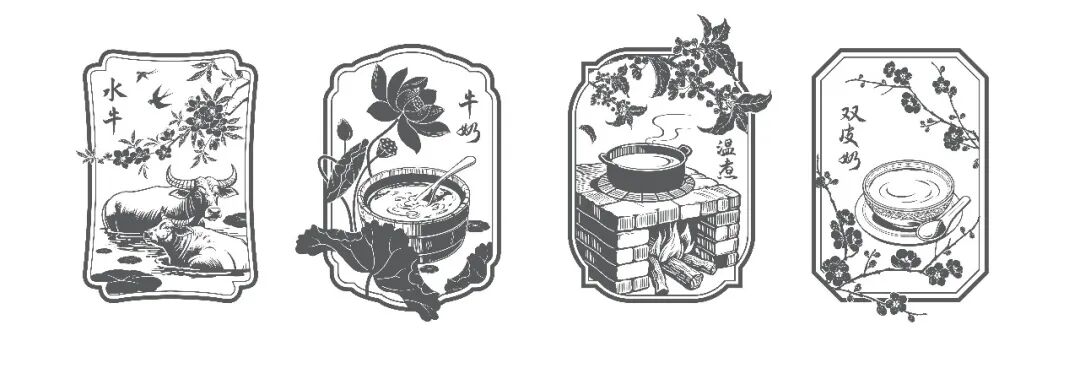 墙面浮雕溯源仁信双皮奶创制起点,承载第三代传承人手艺传承寄托,再现创始人儿时岭南建筑与水牛业记忆。