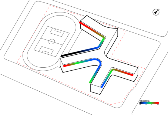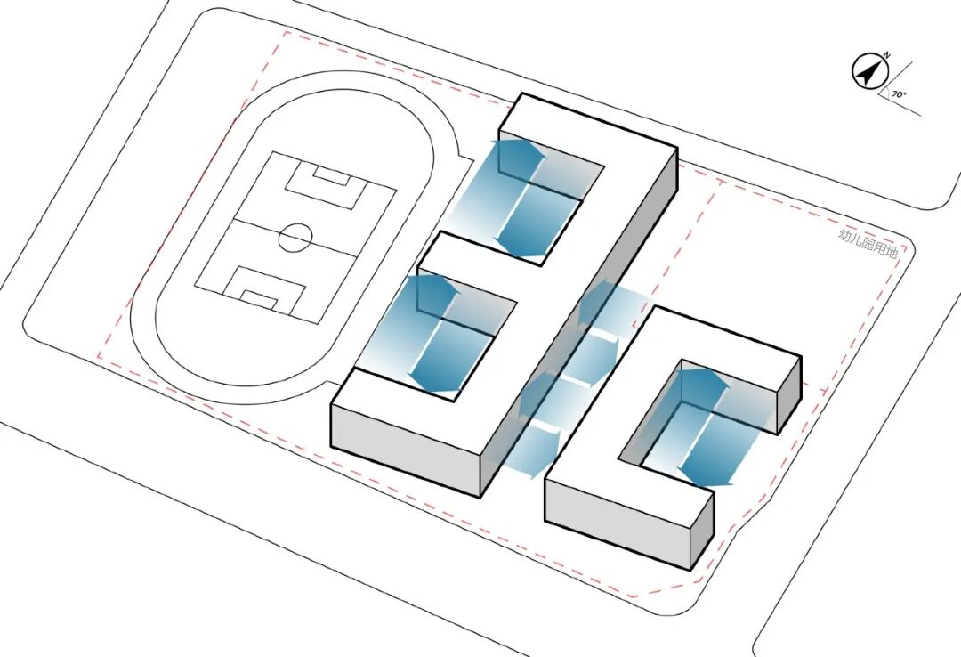 受校园整体规划布局的制约,15班幼儿园立足幼儿身心发展规律与教育需求,依托正南北向规划中轴采用扇形发散式布局,形成连续舒展的线性日照界面,确保幼儿活动空间稳定满足冬至日累计3小时日照的规范要求。充足的日照不仅能为幼儿户外活动提供舒适的环境,更有助于促进幼儿骨骼发育、增强免疫力,为幼儿健康成长筑牢基础。