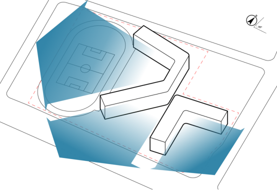 场地存在一项显著制约条件:整体矩形用地呈南偏东20°走向,若建筑沿场地边界平行排布,易引发建筑群体自遮挡日照的问题,且教学楼间距设计受限,造成内外空间形态趋同、缺乏层次。