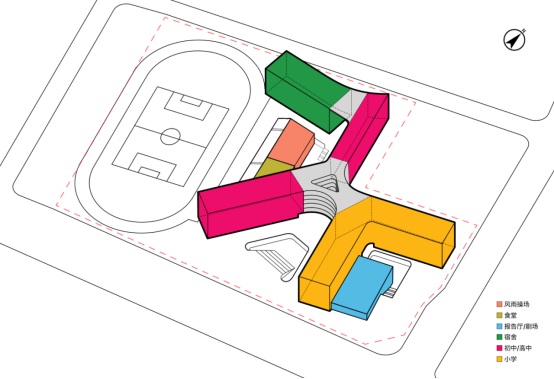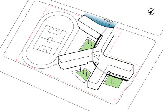 为构建功能集聚、空间复合的学习社区,达成室外教学与运动场地高效扩容的教育综合体建设目标,本设计以“学习社区+体育社区”为核心架构逻辑,对12年制学校采用集约集中式布局。针对场地南偏东20°的特殊朝向条件,教学空间创新性采用发散式布局策略,最大化拓宽自然采光面与景观渗透维度,不仅为课堂教学提供充足的自然光环境——有效减少视觉疲劳、提升学生课堂专注力与学习效率,更塑造出层次丰富、尺度适宜的半围合内院空间。这类灵活的半开放空间可作为课间休憩、小组研讨、创意展示的“第二课堂”,适配多样化的自主学习与互动交流场景。