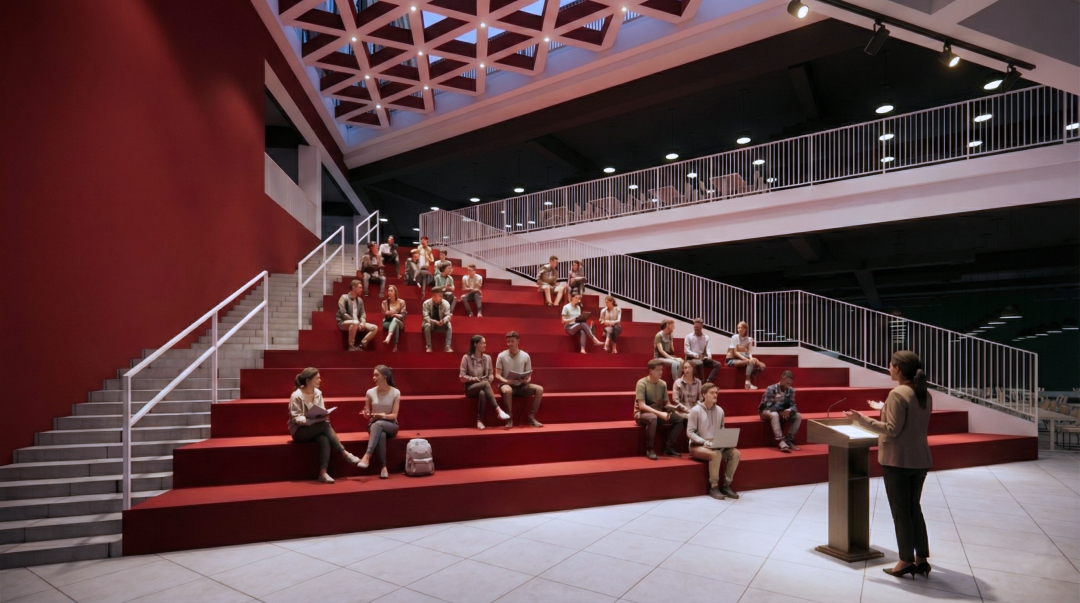 中学组团内,坐落着校园的核心地标——三角能量核,堪称步入校园腹地后最具辨识度的特色空间。标志性的三角形红色大厅,以热烈明快的视觉语言,直观传递出蓬勃昂扬的空间能量。它不仅是串联校园全域的内部枢纽,更集演艺展演、主题演讲、多元交流等功能于一体,成为驱动整个校园活力迸发、思想碰撞的核心“动力源”。
