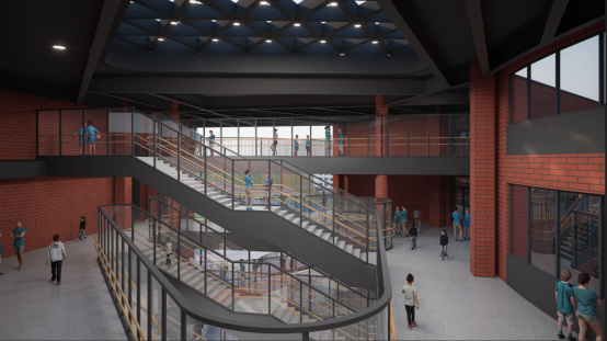 循贯学轴线穿行而过中学组团,便抵达校园的立体共享社区。该空间以跨层连廊系统打破楼层界限,实现中学与小学学段空间的无缝衔接。社区内核为几何形态的三角形中庭,以此为枢纽串联起多个双层高观景平台,构建成跨年级、多场景的立体共享交流场域。