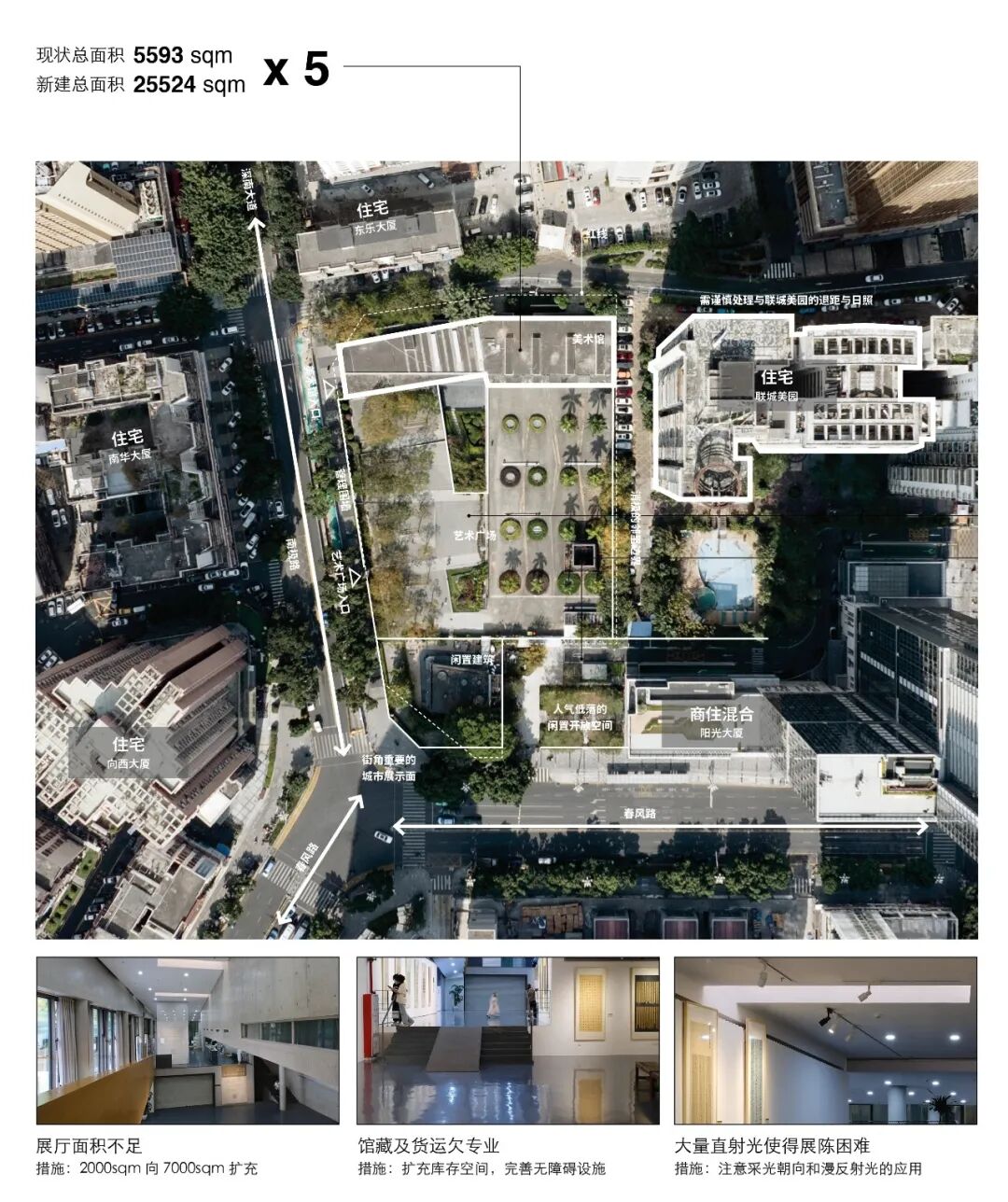 和大多数屹立于空旷场地中的美术馆不同,罗湖美术馆周边高层环绕,扩建五倍建筑规模的同时保持55%绿地率是一个艰巨的挑战。我们的策略是变挑战为机遇,塑造一个充分融入公园中的美术馆;与社区近距离的交融,使得美术馆更方便的实现公共教育使命,服务片区与城市的混合业态将为美术馆更可持续的运营提供支撑。