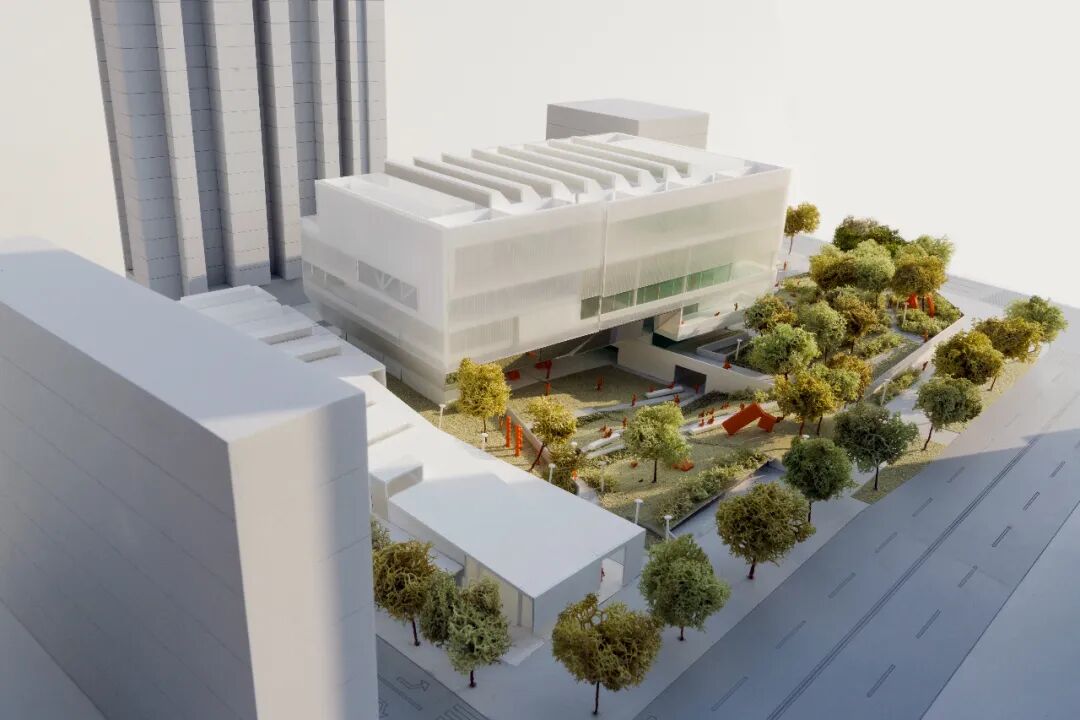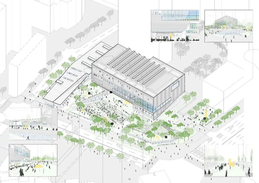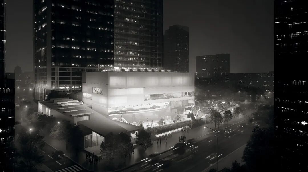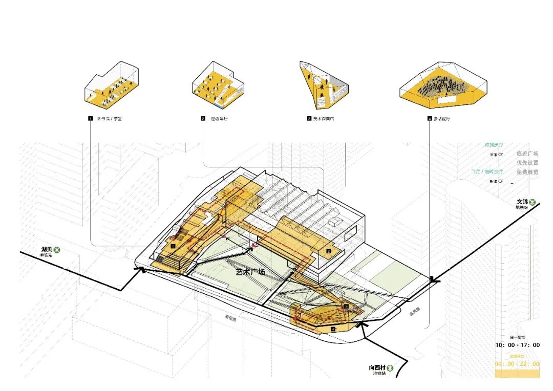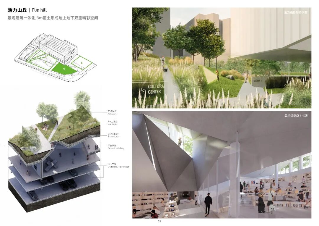 阅读平台与图书馆联通,通透的界面,室内外充分渗透;艺术草坪是城市舞台的重要组成,舒缓的草坡既是观看演出的看台,又是周末休闲野餐或瑜伽的圣地;活力山丘为社区活动和前来美术馆的亲子家庭设计;共享广场则与周边地块共享共建,可以举办艺术市集,布置临时艺术装置。