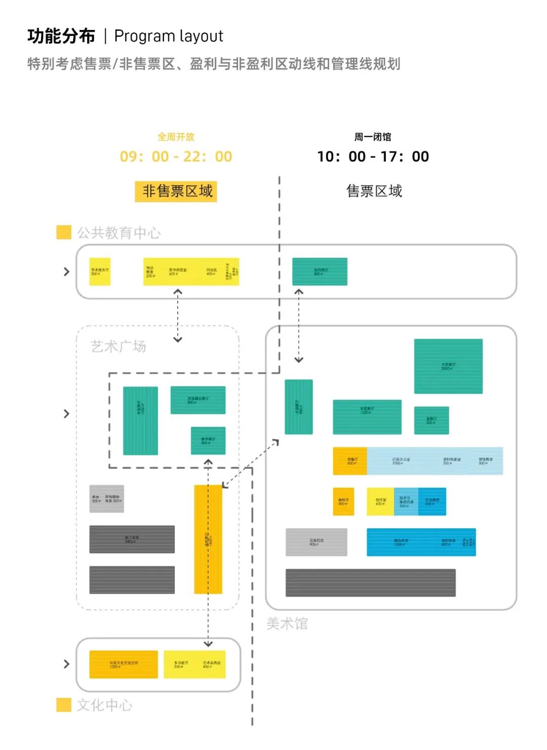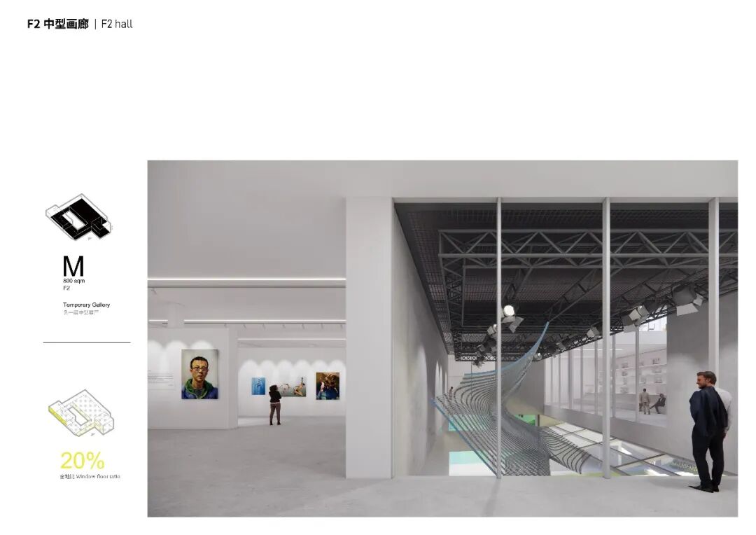 在动线设计方面,多样的动线设计允许不同长度的参观路径。我们特别关注美术馆运营时间范围内外的不同动线场景,允许文化设施和公共教育中心拥有不同的运营时间,甚至7天24小时开放。此外,资深的艺术爱好者还可前往漂浮画廊三层研究室观摩研讨,并可以在相邻的沙龙咖啡厅和艺术研究者互动交流。美术馆办公区设置在四层临近研究区域,工作人员可以从漂浮画廊北侧的独立入口和专属电梯到达。