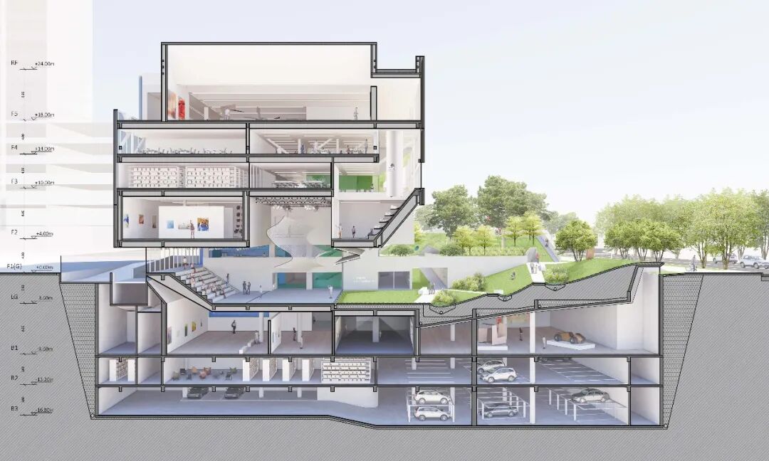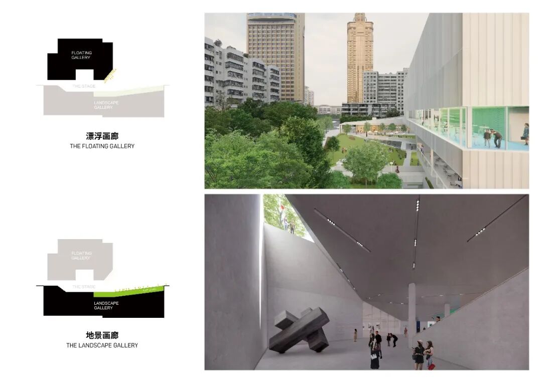 在剖面上,美术馆分为漂浮画廊与地景画廊两个部分,中间嵌入城市舞台,舒缓的绿坡将人们自然带入美术馆的入口大厅。入口上方倾斜的镜面巨幕面向艺术草坪,每个人都可以看到自己,让日常的生活场景转化为艺术本身。