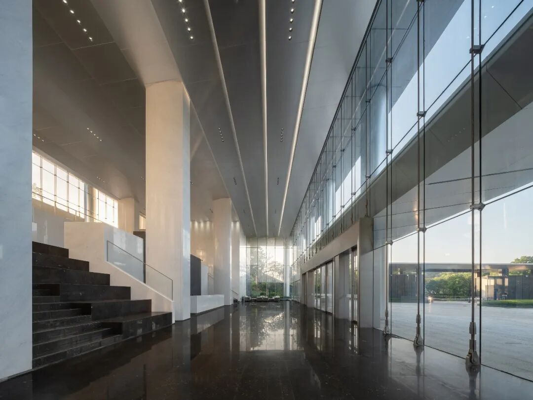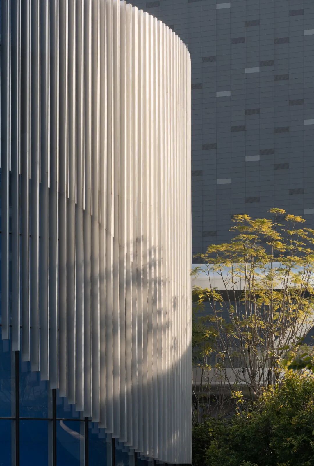 建筑语言回归金融系统的克制表达。立面设计提取深交所建筑体系中的“方格网”与几何秩序,通过“方与圆”的组合关系进行当代转译。