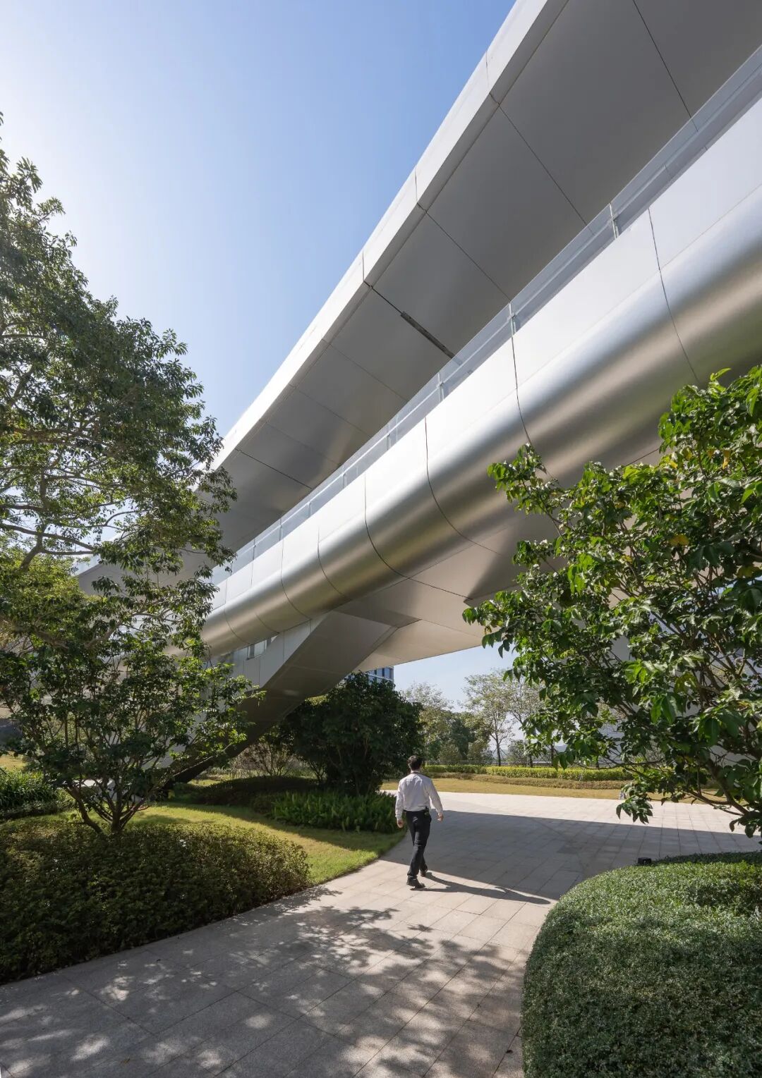 人的动线,决定了园区的真实使用方式。在园区围合而成的中央园林之上,设置“云廊”构建二层立体交通系统,将办公、研发、宿舍与机房运维入口高效串联。在复杂地形与高安保条件下,实现人流与设备流线的清晰分离,也为运维人员提供全天候、无障碍的通行体验。