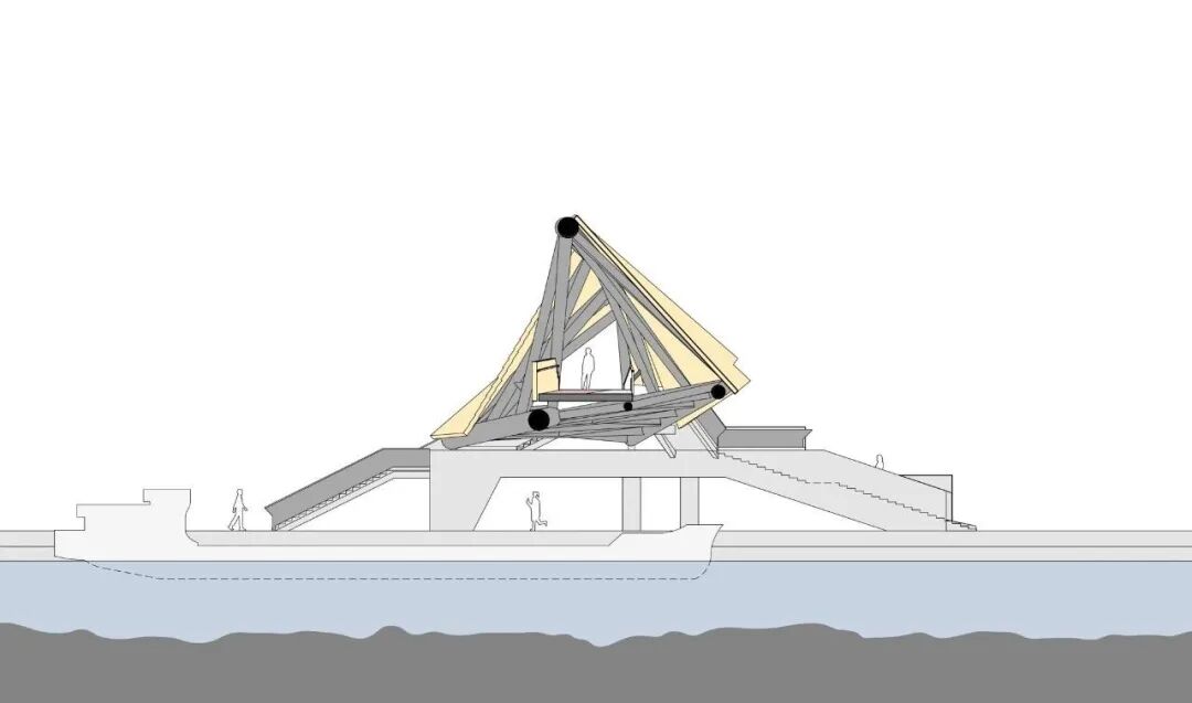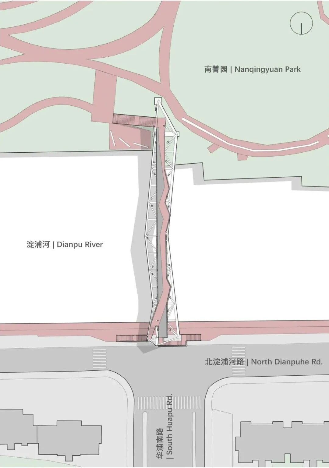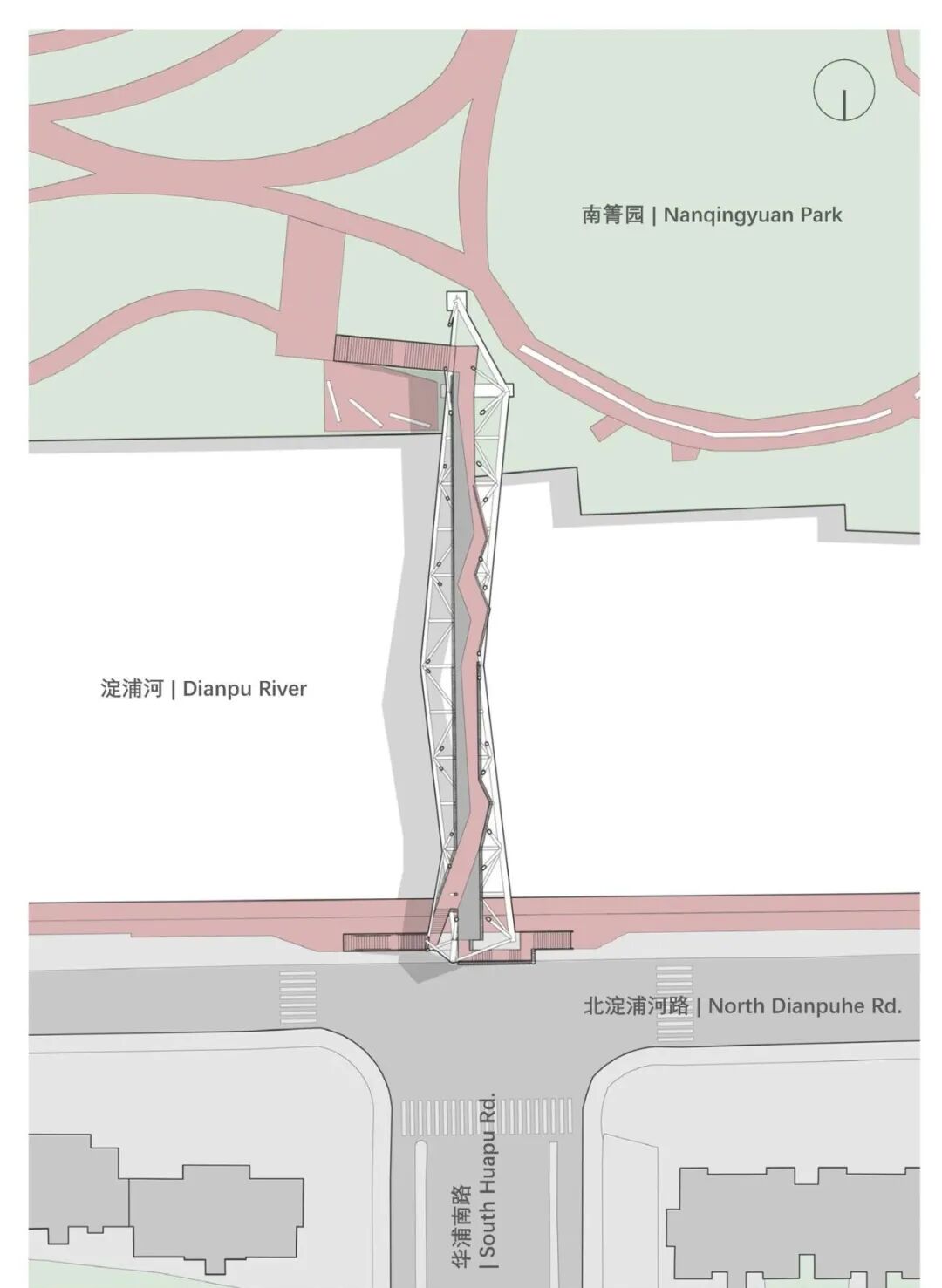 百穗桥的选址为设计带来了结构与场地的双重制约:一方面,水务上一跨过河的要求让桥梁的净跨超过75米,;但与此同时北岸的岸线进深仅6.3米,需在这样局促的空间中完成大跨桥梁支撑结构以及架高4m的桥梁阶梯的路径组织设计。此外,施工期间仍需保证淀浦河正常通航。