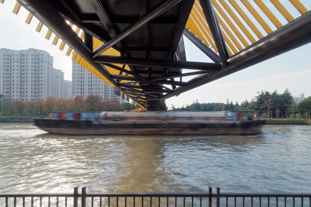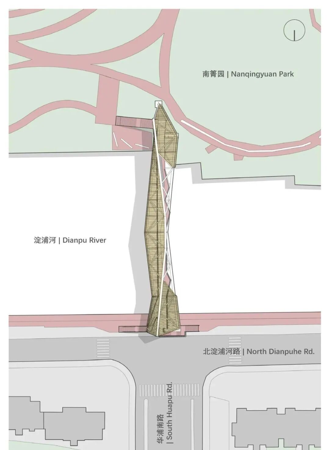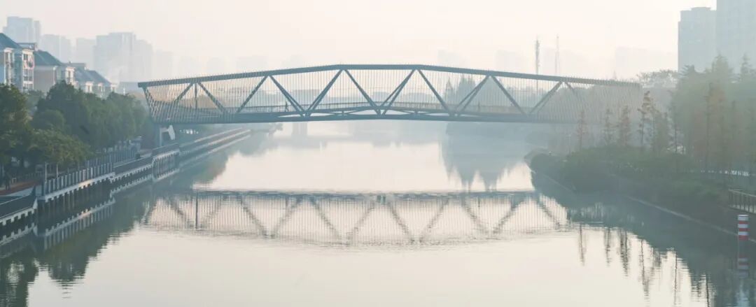 上海市青浦区位于太湖流域下游,具有典型的江南平原河网城市的特征。自西向东的航道淀浦河对于区域城市格局发展产生了重要的影响。每一座跨河桥梁都因通航要求被架高,引桥长度往往超过百米。为控制引桥这对沿岸城市地块的沿河交通产生显著阻隔,跨河桥梁的平均间距超过1km——这使得在规划上被定义为“蓝轴--滨水游憩轴”的淀浦河,实际上成为了一道“蓝墙"。因此,在机动车桥之间适当增设步行桥,建立相对合理的跨河慢行系统的需求十分迫切。这也是在居住区旁建设大跨度的纯步行桥的城市地理与规划背景。