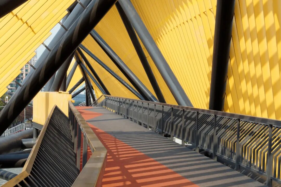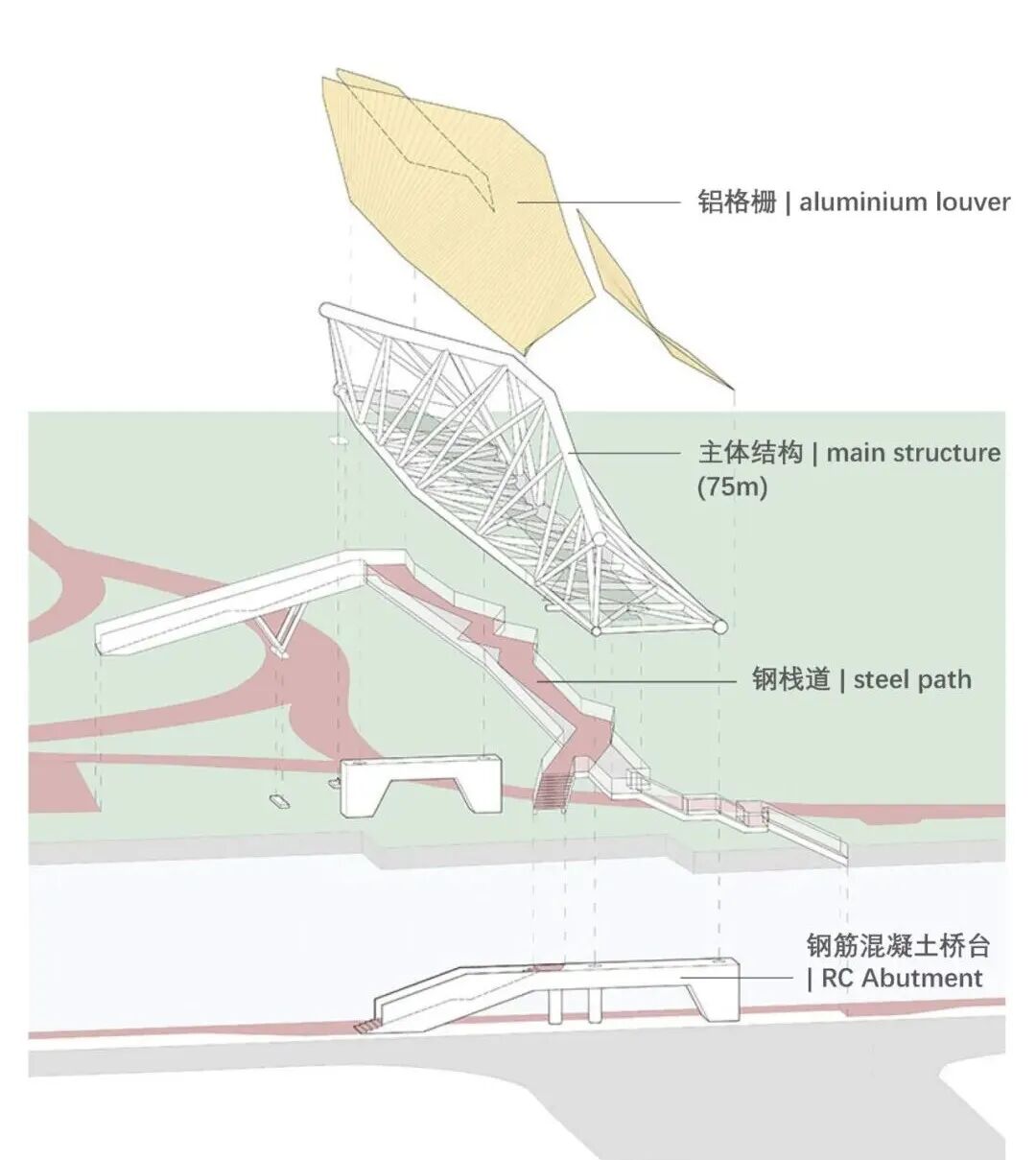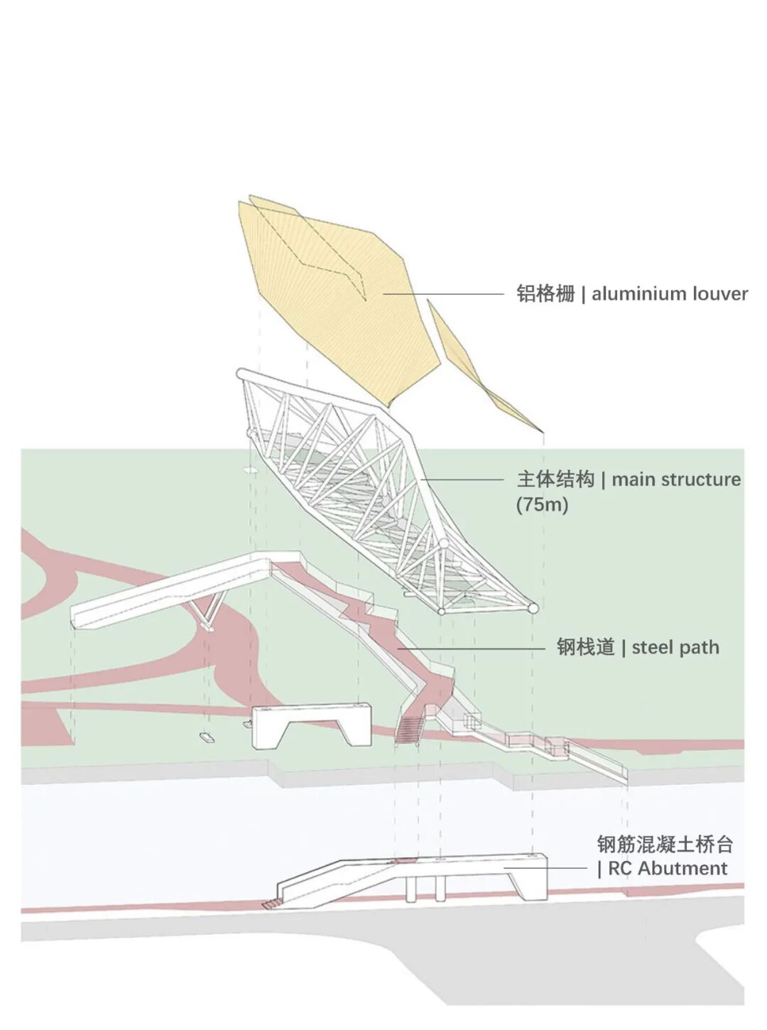 总体上主要采用三个综合的策略:一、平面上笔直的栈道从中央穿过扭转摇摆的结构体形成穿越桥梁的空间体验基调;二、局部设置的阳光色的格栅在桥梁上形成了上游下游的感知区分;三、通过几何的经营,以不同的权宜方式在桁架杆件之间寻找机会穿越的楼梯踏步空间。通过这样的从系统组织到局部迂回的设计方式,形成与航拍图像所显示的截然不同的丰富的现场穿越空间体验感。