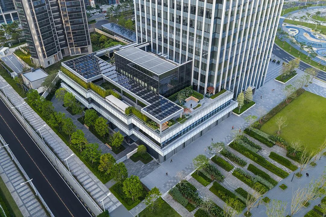 The BIPV system integrates solar cell technology into laminated spandrel glass panels while maintaining the high-gloss aesthetic of the curtain wall. An additional 2,100 square meters of photovoltaic panels are installed on the tower and podium roofs, bringing the total photovoltaic area to 3,200 square meters and enabling a renewable energy utilization rate of 15%—a significant achievement for an office tower.
