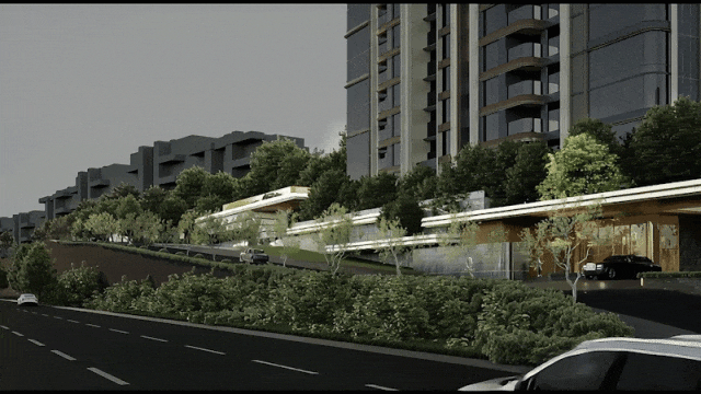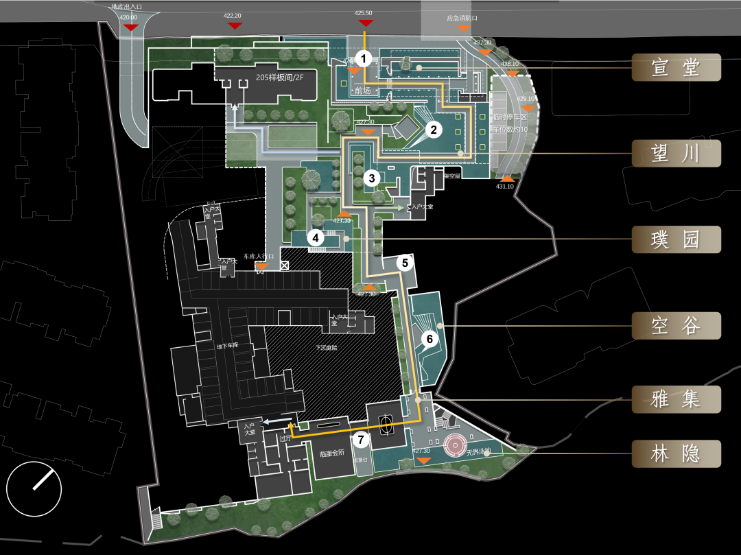 整个示范区的游览及归家动线设计为通过城市匝道平接进入第一层台地,再从高处台地下方穿行至悬崖会所,会所整体位于同一标高。未来的行车动线也将利用道路高差,实现车辆平顺进入车库。