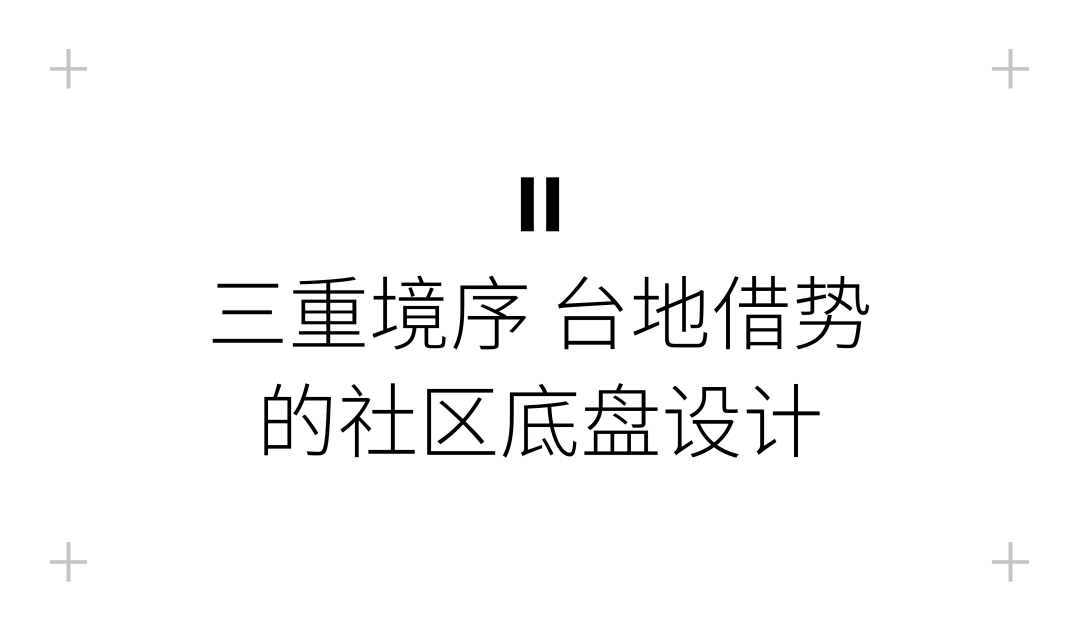 场地西北侧是本地块最低标高处,与地块内产生最大高差12m。在重庆于去年5月发布的关于支持适度建设地上车库的新规下,设计顺应地形规划部分台地,并将整体场地形成了两个分台,去贴近原始地形,节约了整体的土石方成本。项目底盘设计充分利用场地高差,系统平顺地梳理整体动线,将会所动线、归家动线、车行动线分别错层平行组织,化繁为简,实现人行与车行的无感归家体验。