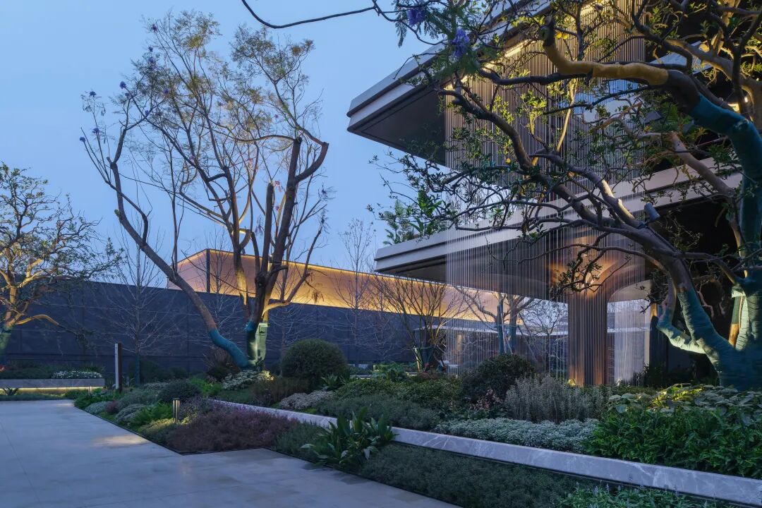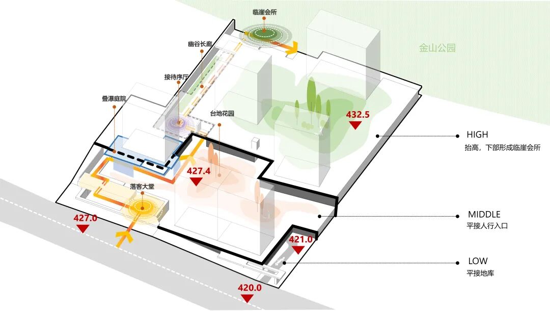 本项目底盘由三大场景序列构成:从临街人行入口的仪式归家界面,到内部多重庭院的游园体验,最终抵达可俯瞰金山公园的临崖会所。