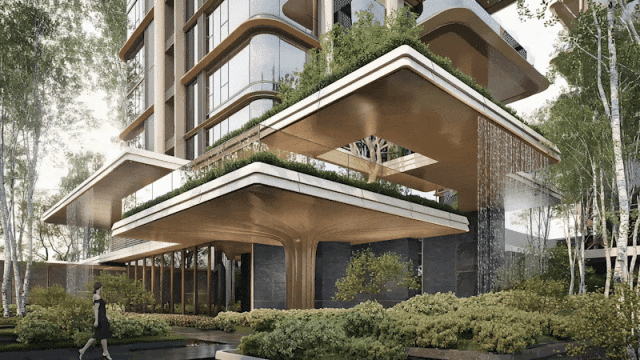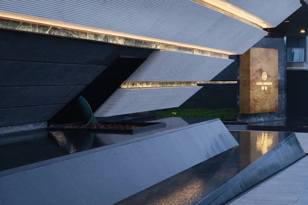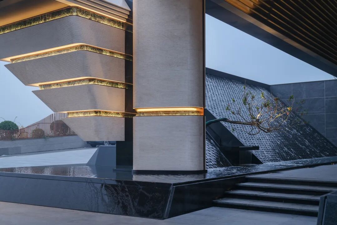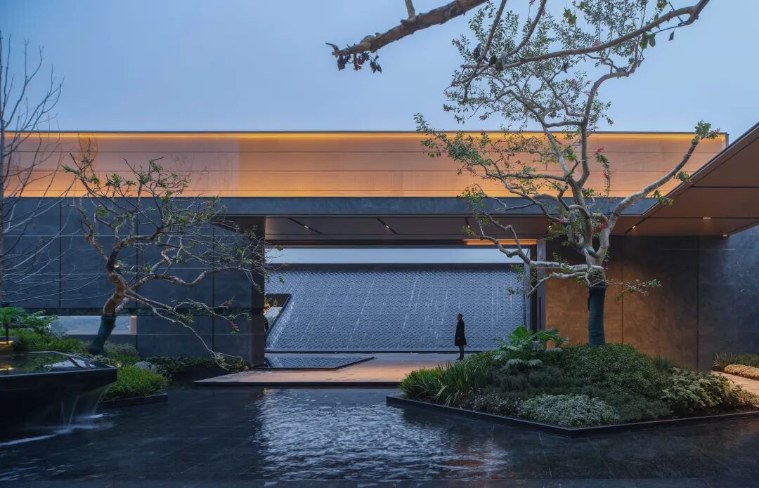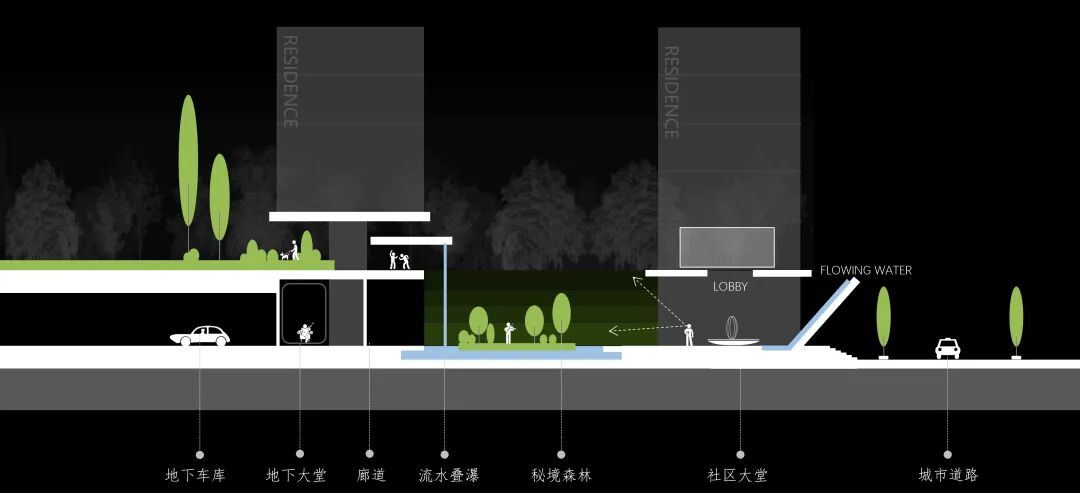 经过社区大堂的转折,进入到以“流水叠瀑”为核心的水院空间,设计意境致敬赖特的经典作品流水别墅,结合车库层+架空层,打造自然错落生长的平台。