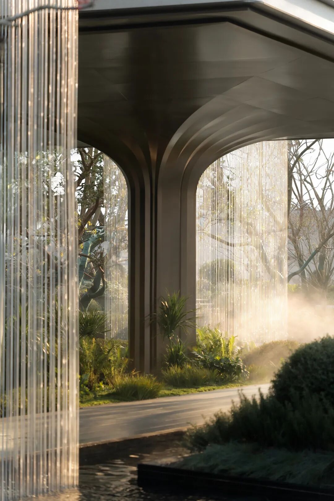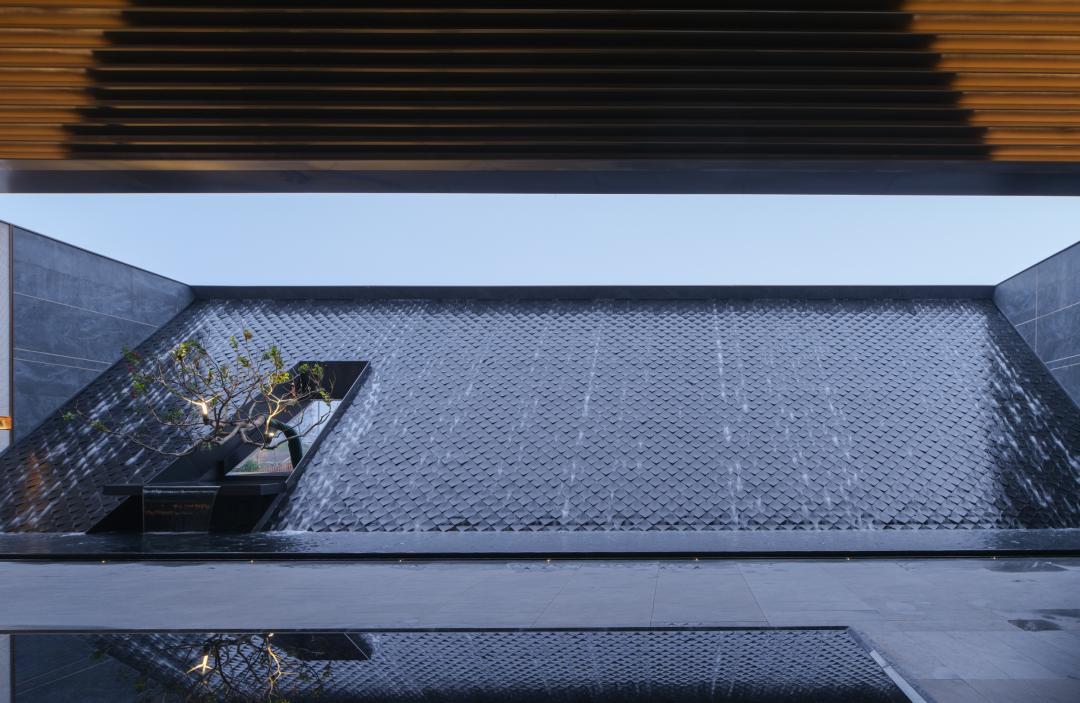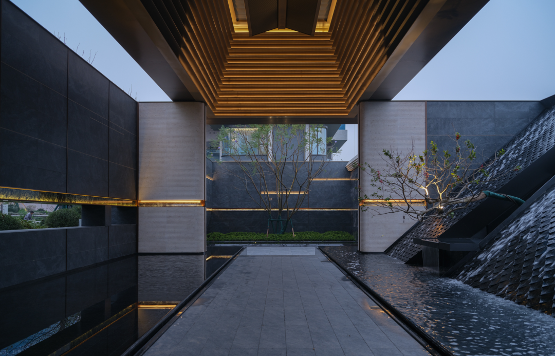 大门设计强调张力但又克制。在这个序列空间里,外侧临街的倾斜造型,也是内侧空间构成的一部分,斜面上营造景观的涓涓流水,以灰空间和自然的水声屏蔽城市的喧嚣。