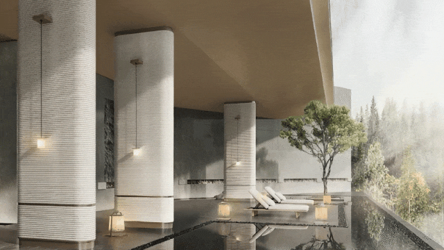 穿过水院,是建筑、景观、室内一体化设计的“幽谷长廊”,漫步至长廊尽头,即显现了金山公园的美景和城市天际线。由于场地狭小,我们充分侧重营造灰空间来构建社区临崖会所空间,无边界水景引入山林雾气和日升日落的景象,强化了人与自然的连接。