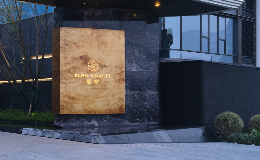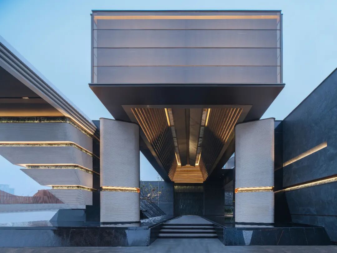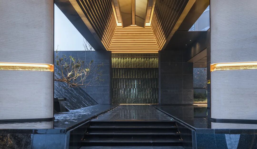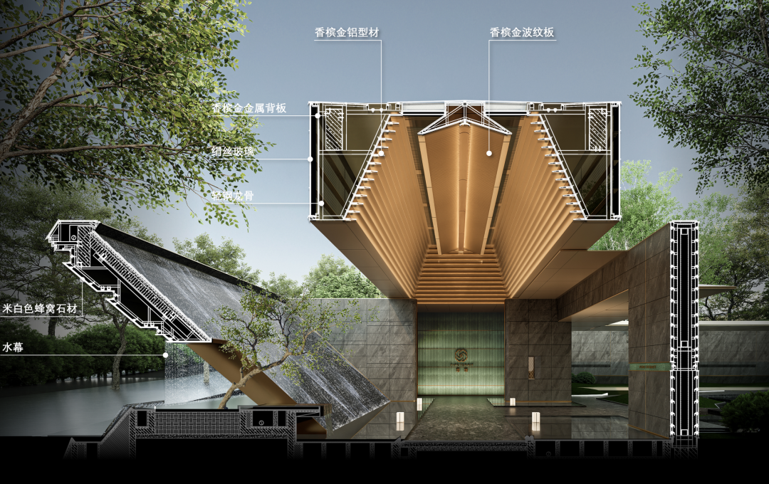 落客大门用浅色的贝金米黄石材+深灰色奢石+艺术画做旧工艺的金属板面形成色彩与体量的对比,拉槽绿色奢石予以点缀,增添人文艺术气息。